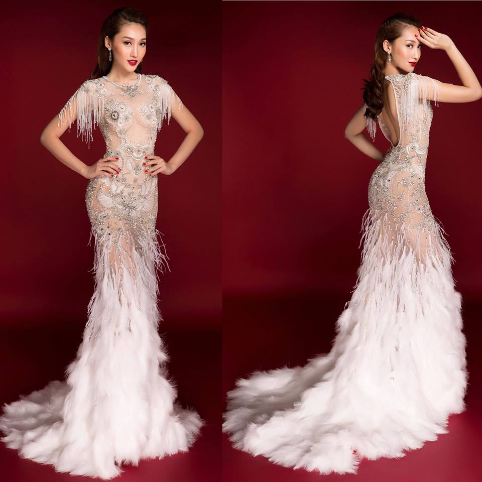 Mới đây, một thiết kế tương tự được nhà mốt Lê Thanh Hòa “đo ni đóng giày” cho đại diện Việt Nam ở Hoa hậu Thế giới 2017. Chiếc váy có phần chân đính lông vũ sang trọng và bay bổng, làm tăng thêm nét mềm mại cũng như “kéo dài” đôi chân cho hoa hậu Đỗ Mỹ Linh.