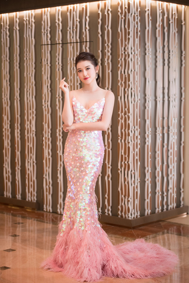 Đầu năm 2017 á hậu Huyền My xuất hiện với bộ cánh hồng với điểm nhấn là phần lông vũ tạo sự sang trọng, thướt tha.