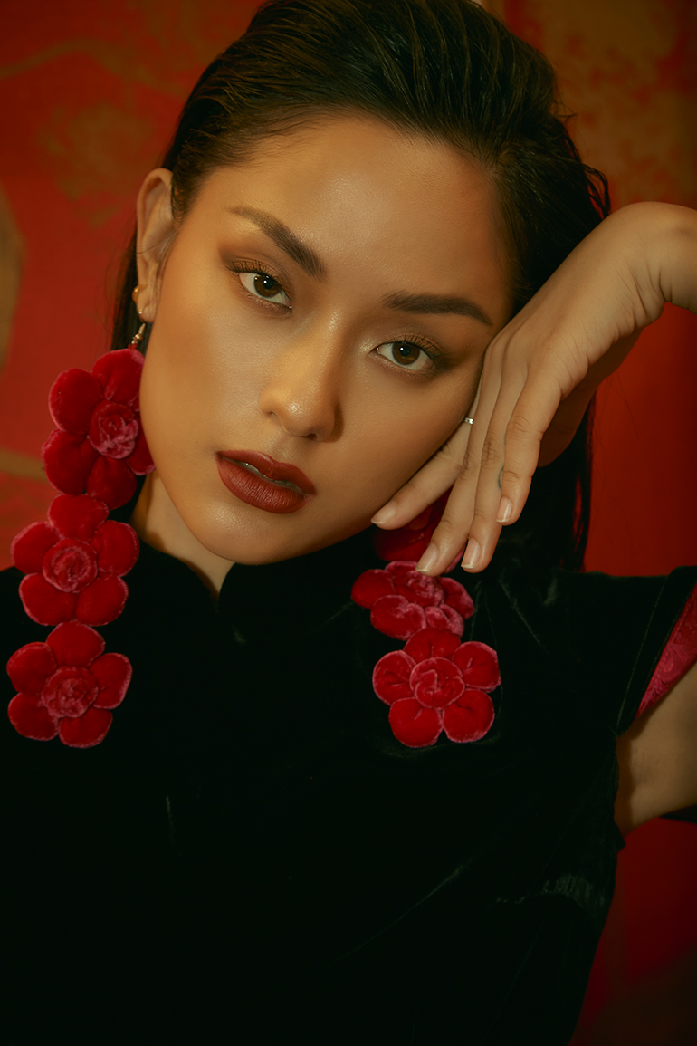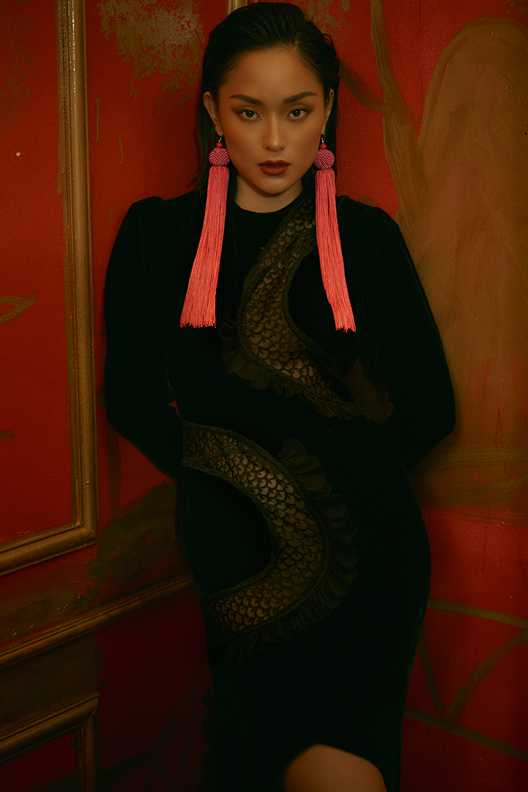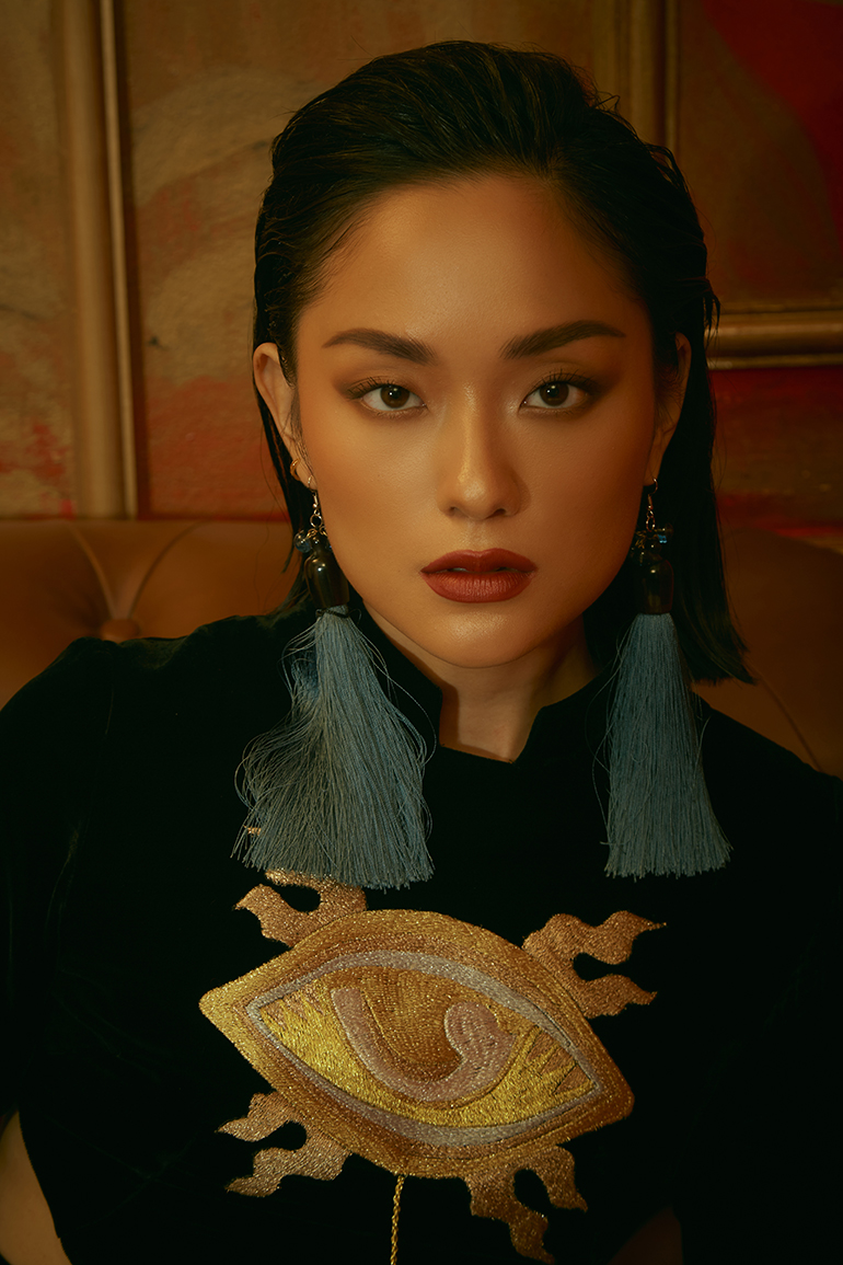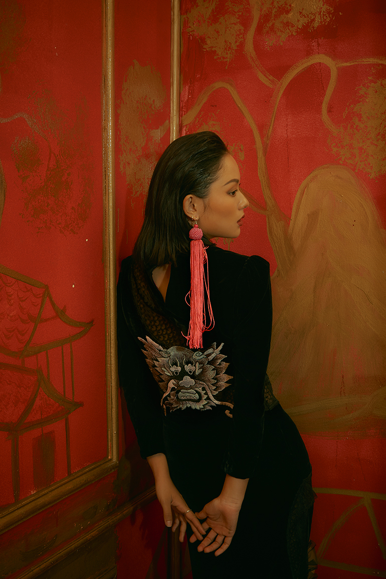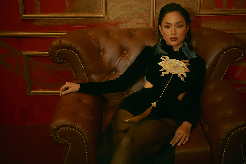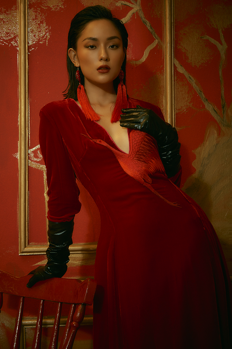 Nét văn hoá phương Đông cũng được chị thể hiện rõ rệt qua các hoạ tiết rồng, lân, cò, con mắt cổ trên trang phục. Các hoạ tiết đều được những người thợ thủ công thêu tay tỉ mỉ, cầu kỳ và tinh tế.