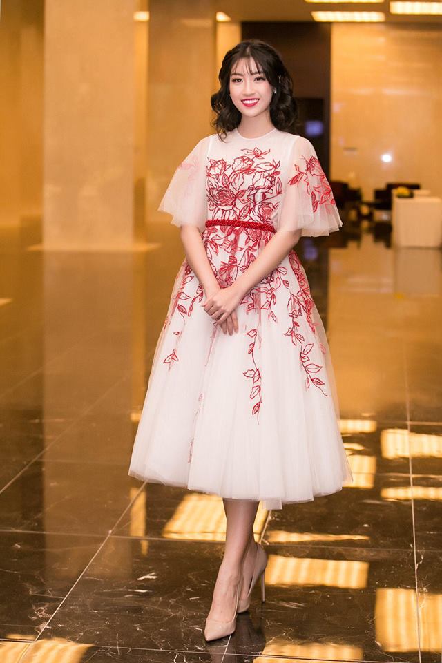 Nhan sắc ngọt ngào, băng thanh của Đỗ Mỹ Linh càng được tôn lên khi người đẹp diện những kiểu váy xòe, chất liệu voan nhẹ nhàng. Ngoài váy đuôi cá, có thể nhận định, đầm xòe công chúa là lựa chọn thứ hai được được đương kim hoa hậu Việt Nam ưa chuộng.