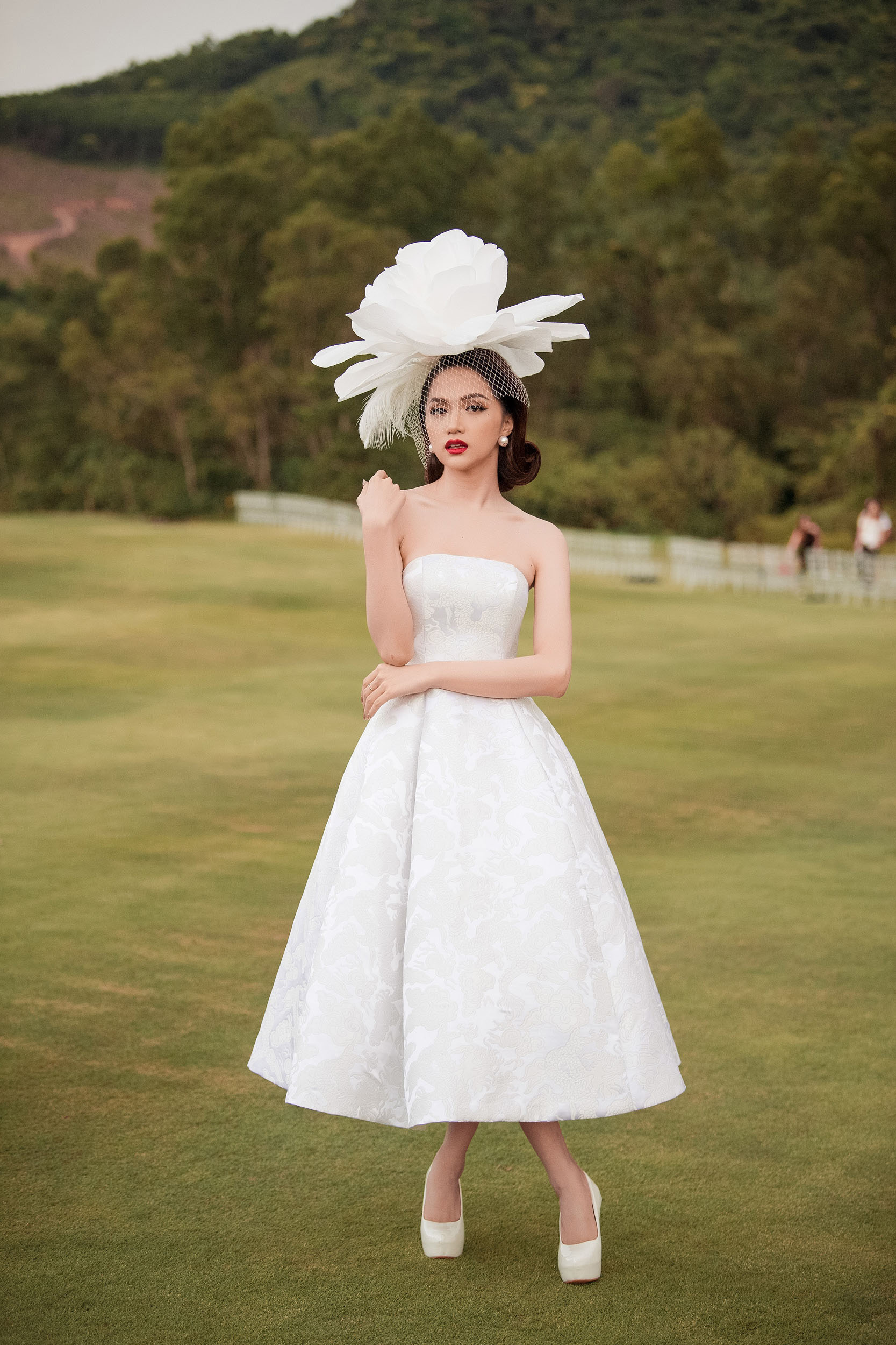 Mái tóc đen dài rẽ ngôi của “nàng thơ xứ Huế” - Ngọc Trân hoàn toàn phù hợp với chiếc váy bồng bềnh mà cô lựa chọn.