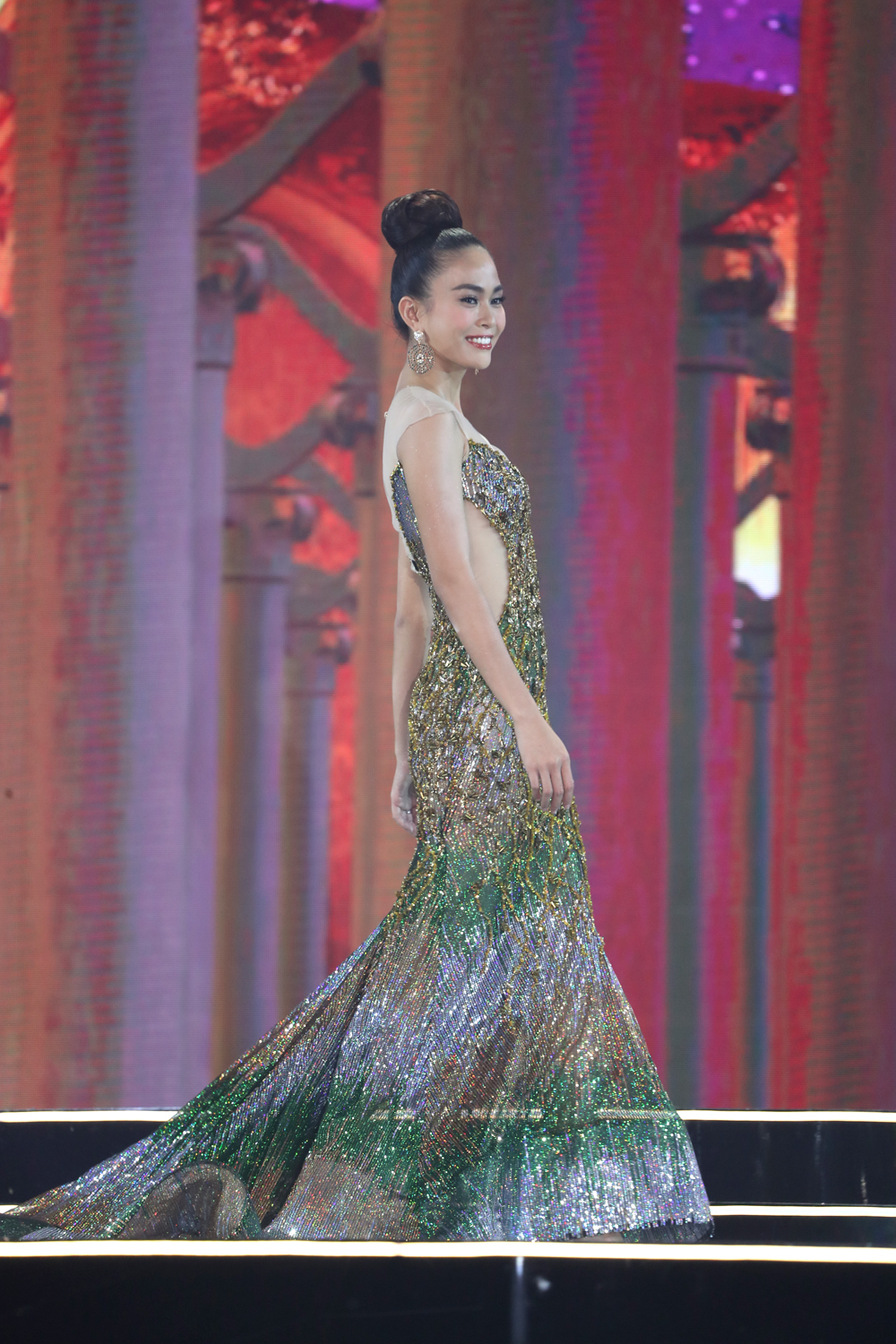 Trong bộ đầm xanh đuôi cá ánh kim của NTK Lý Quí Khánh, Mâu Thủy tỏa sáng trên sân khấu nhờ kỹ năng chuyên nghiệp. Việc dừng chân ở vị trí á hậu 2 khiến nhiều người tiếc nuối vì chân dài sinh năm 1992 được đánh giá nhan sắc vượt trội cùng hình thể chuẩn.