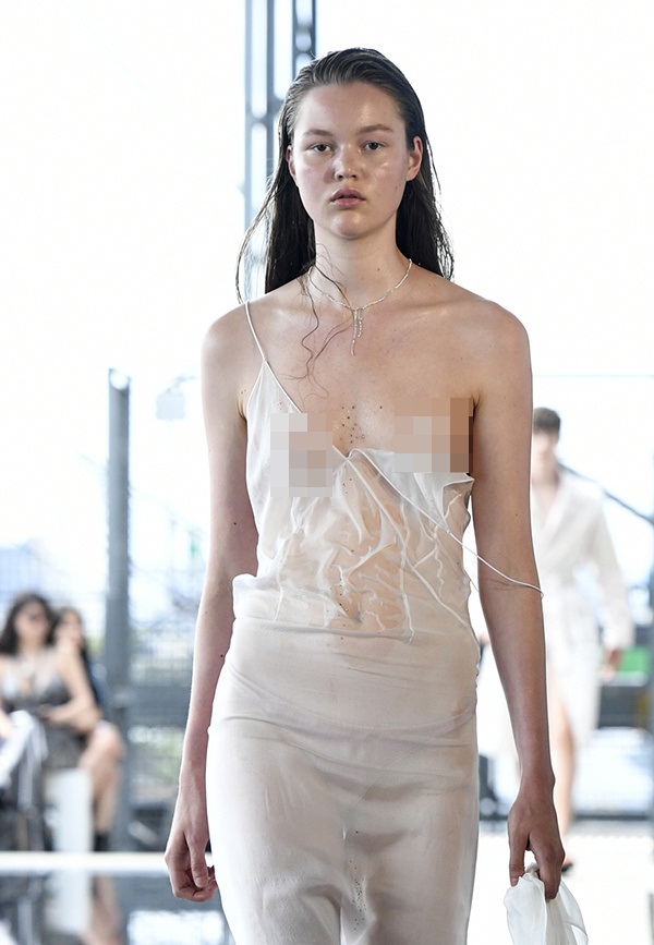 Thậm chí NTK còn xịt nước lên các mẫu thiết kế với thông điệp như muốn nói mùa hè đến sẽ gây ra nóng bức,chảy mồ hôi, các thiết kế kiệm vải và xuyên thấu của anh sẽ vô cùng phù hợp trong khí hậu mùa hè
