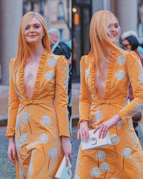“Tiên nữ giáng trần”” Elle Fanning tiếp tục ” hớp hồn” fan trước thềm show Miu Miu tại Tuần lễ thời trang Paris trong bộ váy vàng xẻ sâu vòng 1 vô cùng xinh đẹp.