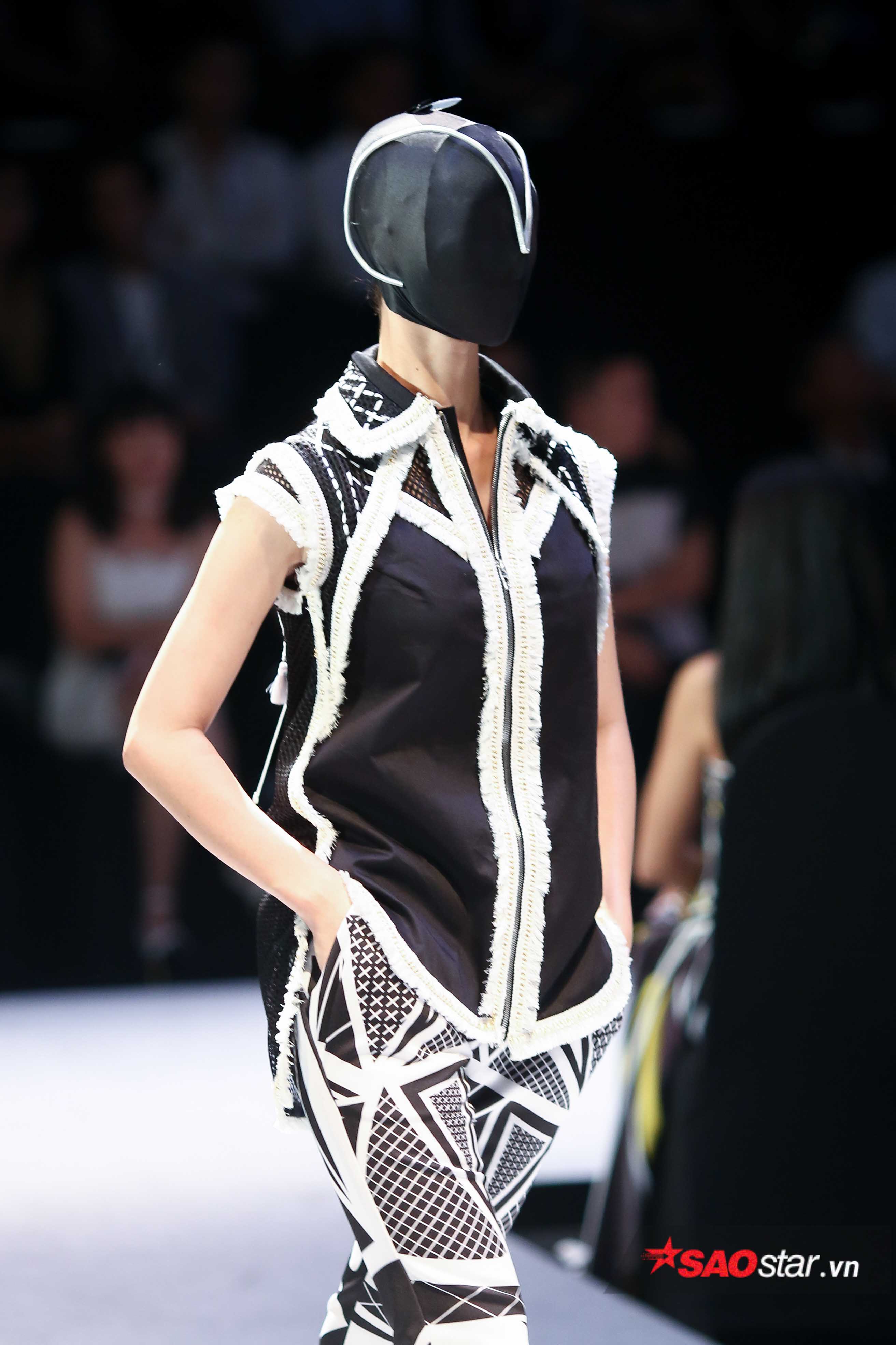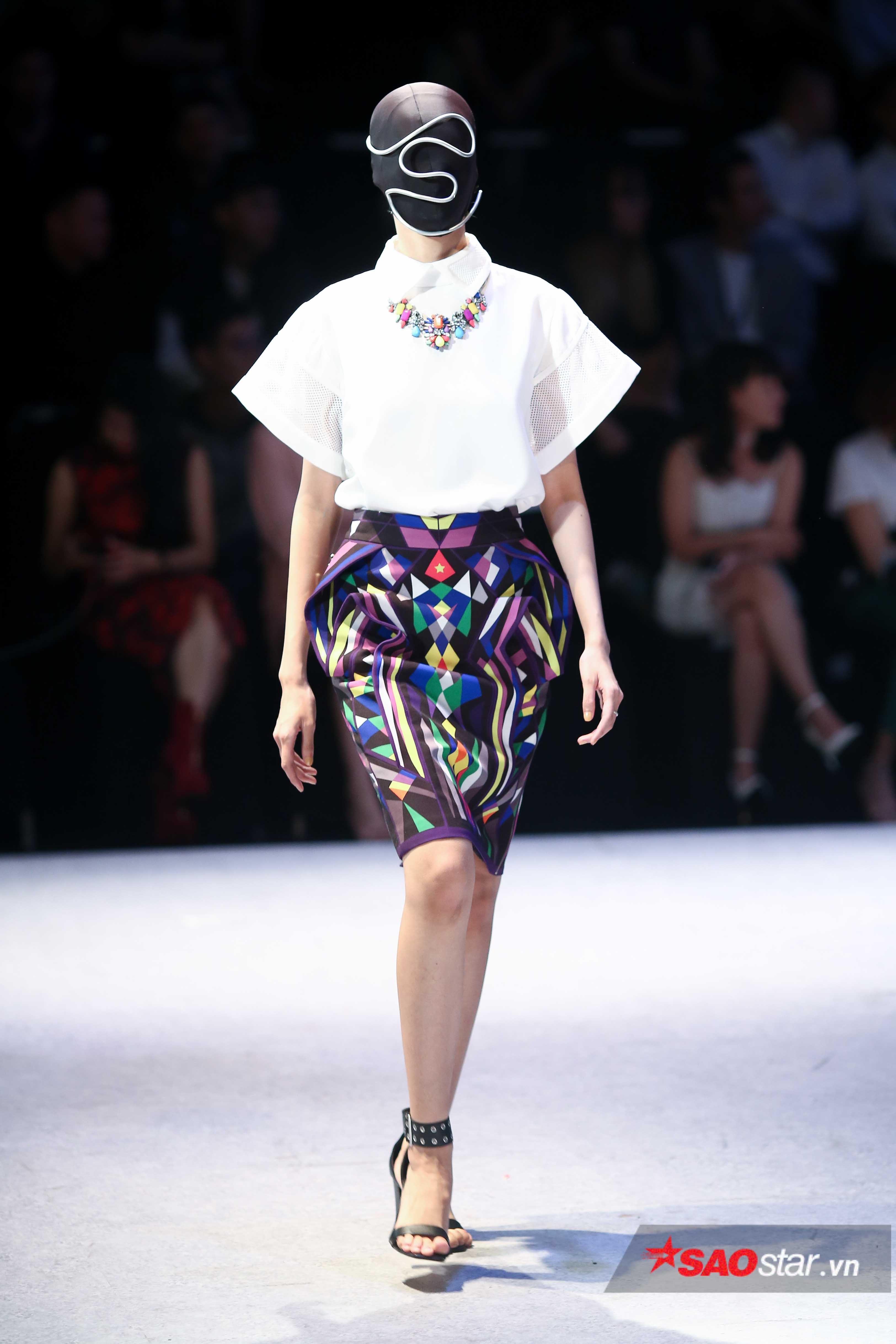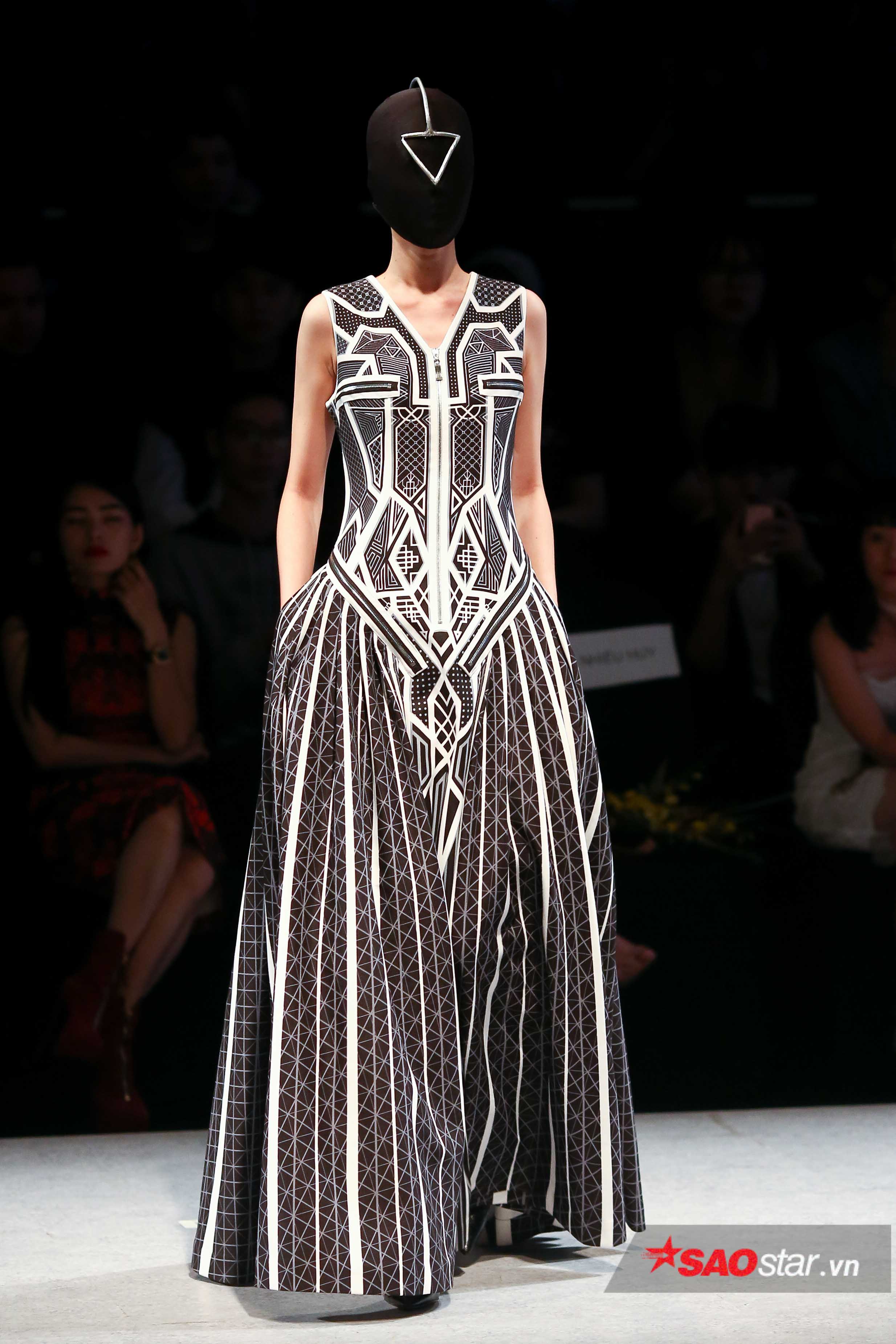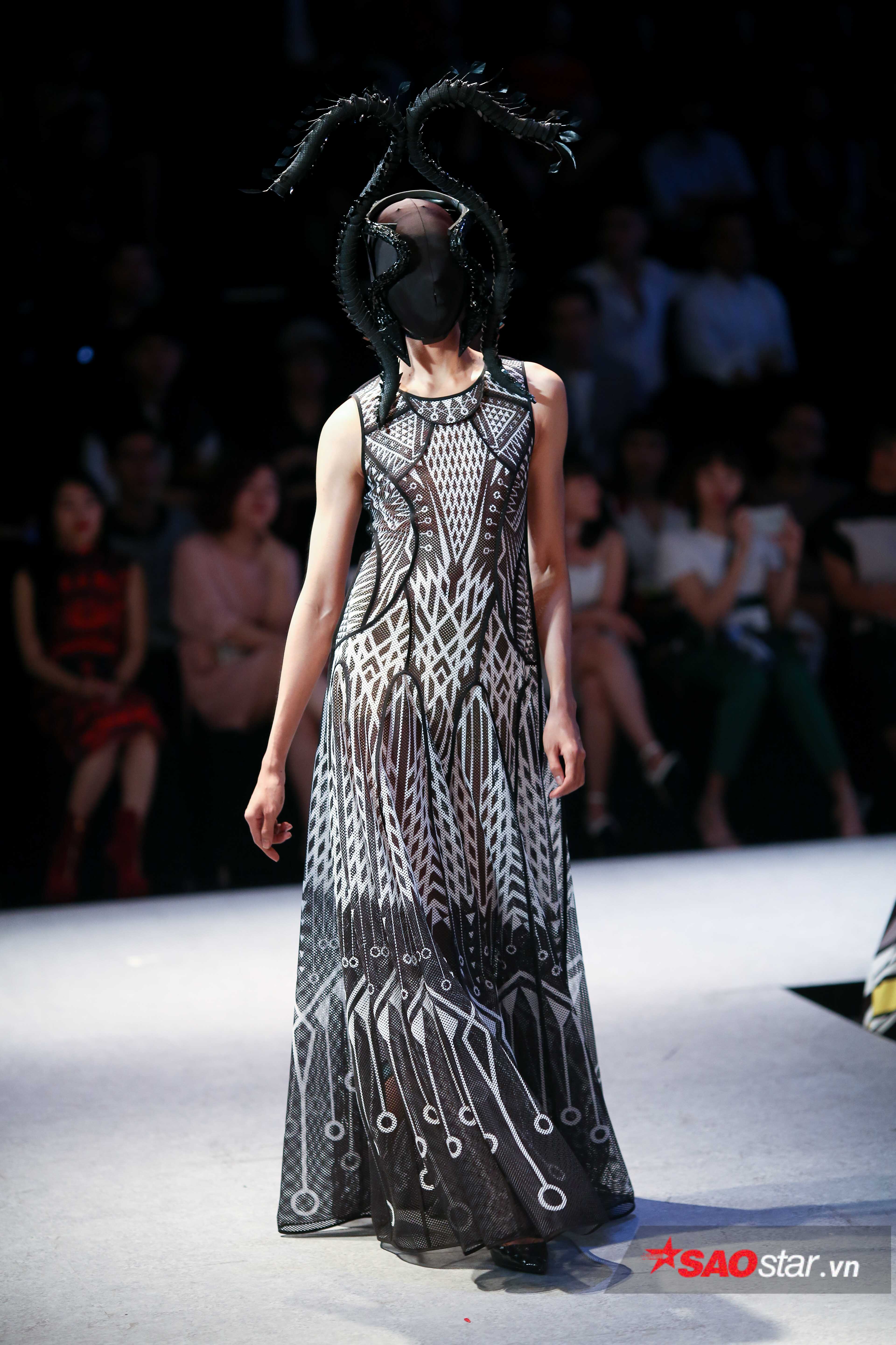 Họa tiết hình tam giác đội đầu phối cùng một trong những trang phục cầu kì nhất của BST.
