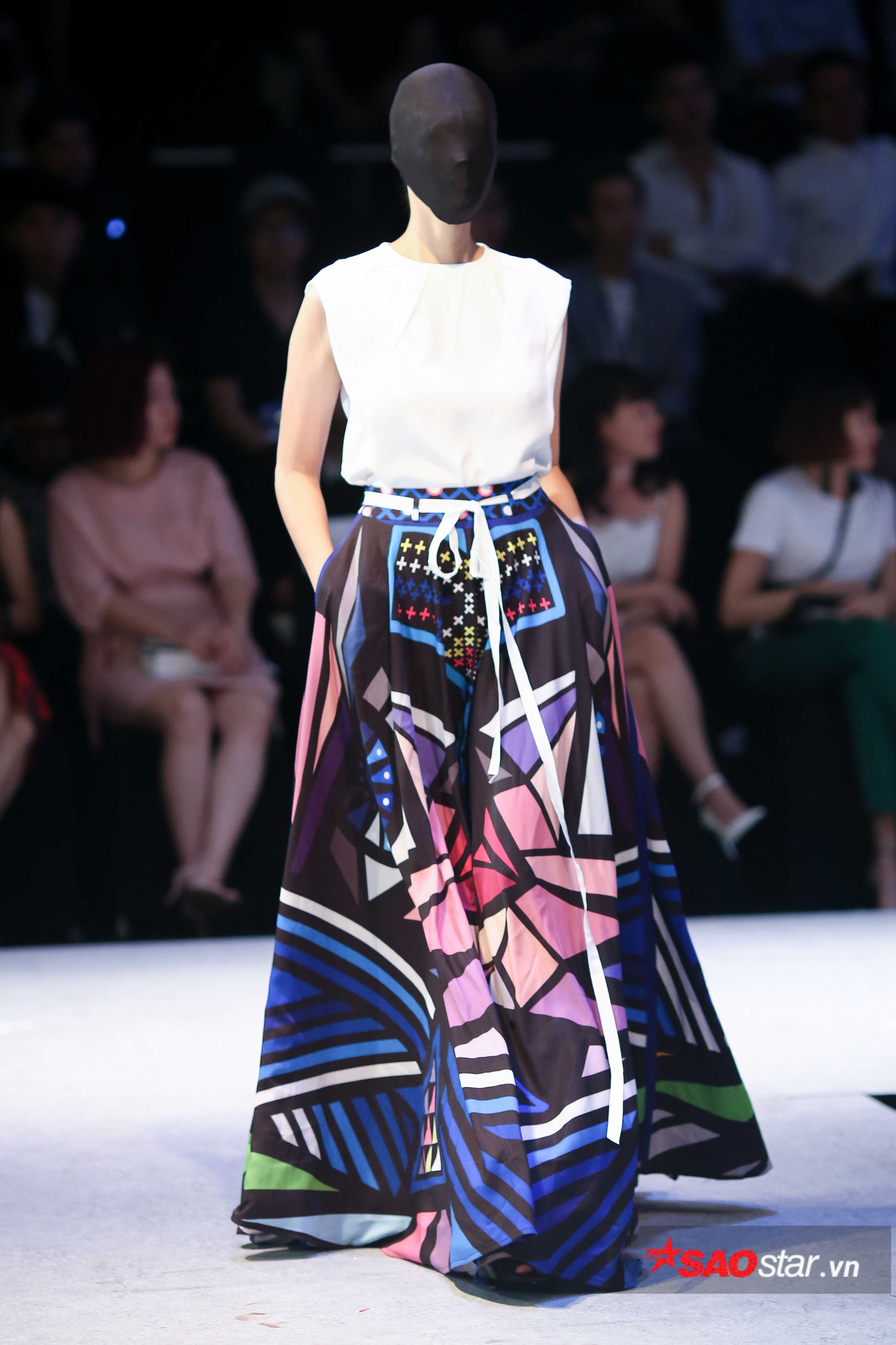 Những chiếc áo trắng được kết hợp với chân váy họa tiết hình học mang màu sắc rực rỡ.