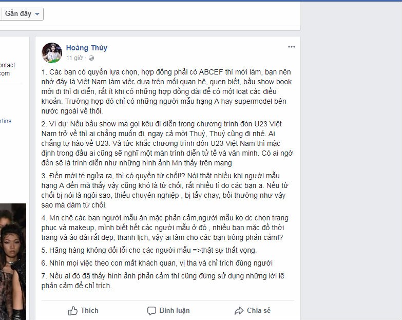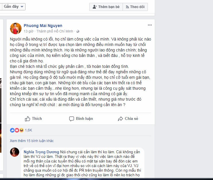 Quán quân Vietnam's Next Top Model 2017 cho rằng: “Việc hãng hàng không từ chối chịu trách nhiệm với tiết mục trình diễn trên máy bay là hèn hạ. Đổ lỗi cho nhóm diễn viên là vô liêm sỉ. Kiếm lợi dựa trên việc bôi nhọ hình ảnh của những cá nhân “thấp cổ bé họng” là việc làm của người có tầm nhưng không có tâm”.