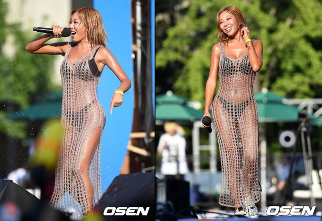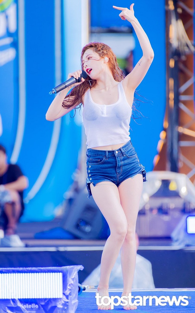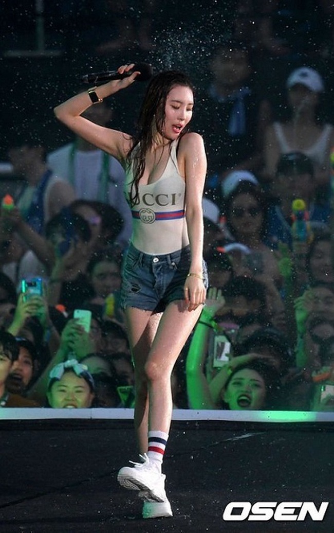 Cựu thành viên Sistar vào lễ hội âm nhạc năm ngoái chọn cho mình thiết kế đồ bơi một mảnh cut-out mix cùng chiếc áo lưới và quần jeans ngắn cũn cỡn. Động tác vũ đạo gợi cảm khiến khán giả tại show “đỏ” hết cả mặt.