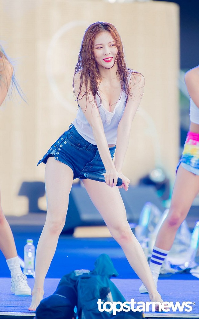 Chiếc quần ngắn cũn cỡn khiến Hyuna lộ thân hình kém săn chắc, vòng ba lép kẹp lộ khuyết điểm