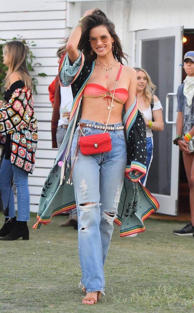 Cựu Thiên thần nội y Alessandra Ambrosio trẻ trung, tươi tắn trong style hơi hướng bohemian với áo bơi sặc sỡ mix cùng quần jeans rách cùng chiếc áo khoác ngoài dáng dài tại Coachella 2019