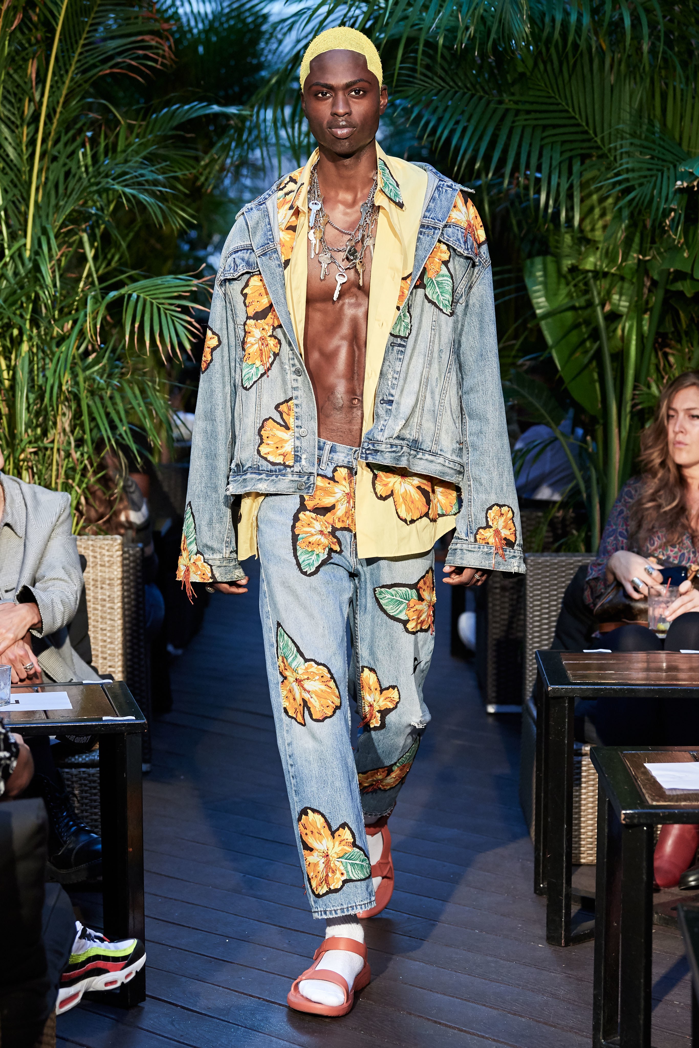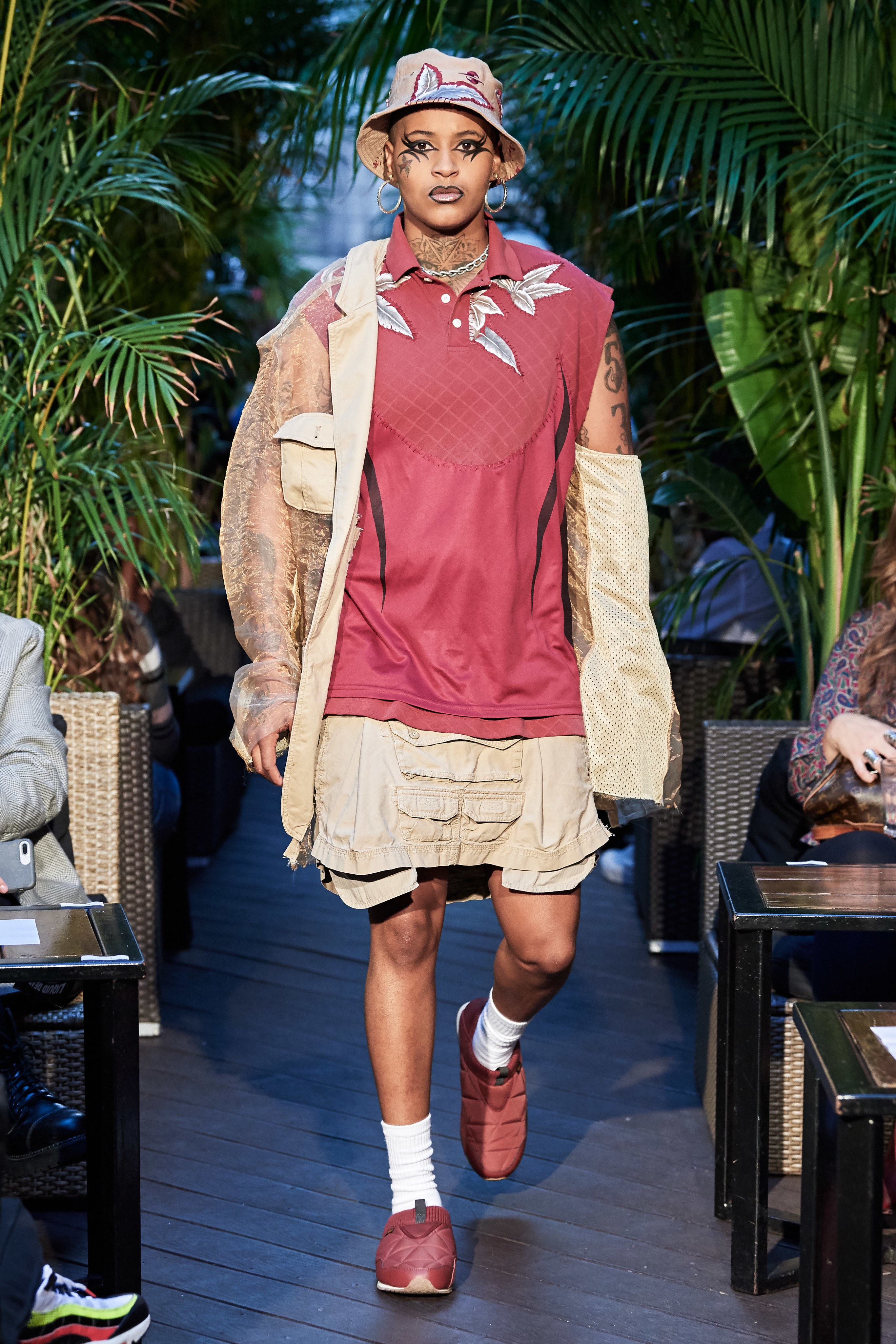 Mới đây, NTK Rio Uribe của thương hiệu Gypsy Sport đã trình làng những thiết kế lạ mắt, mang âm hưởng mùa hè rõ rệt. Trong đó, việc dàn người mẫu để ngực trần, trang điểm đậm theo phong cách drag queen và vẽ họa tiết da động vật phủ kín người cũng theo đó tạo nên sự chú ý.