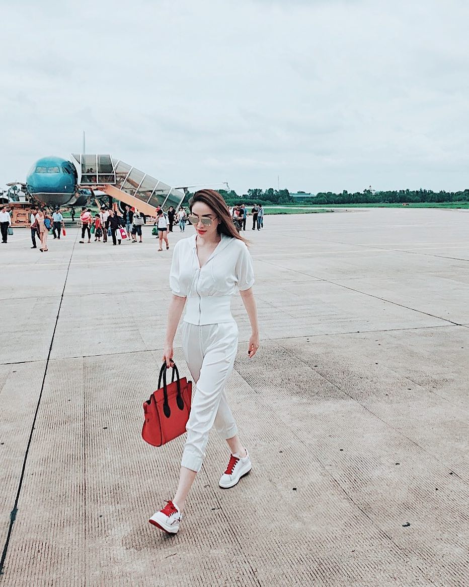 Chiếc túi đỏ mix cùng dây giày cùng tông là cách để Bảo Thy tạo điểm nhấn cho bộ trang phục của mình.