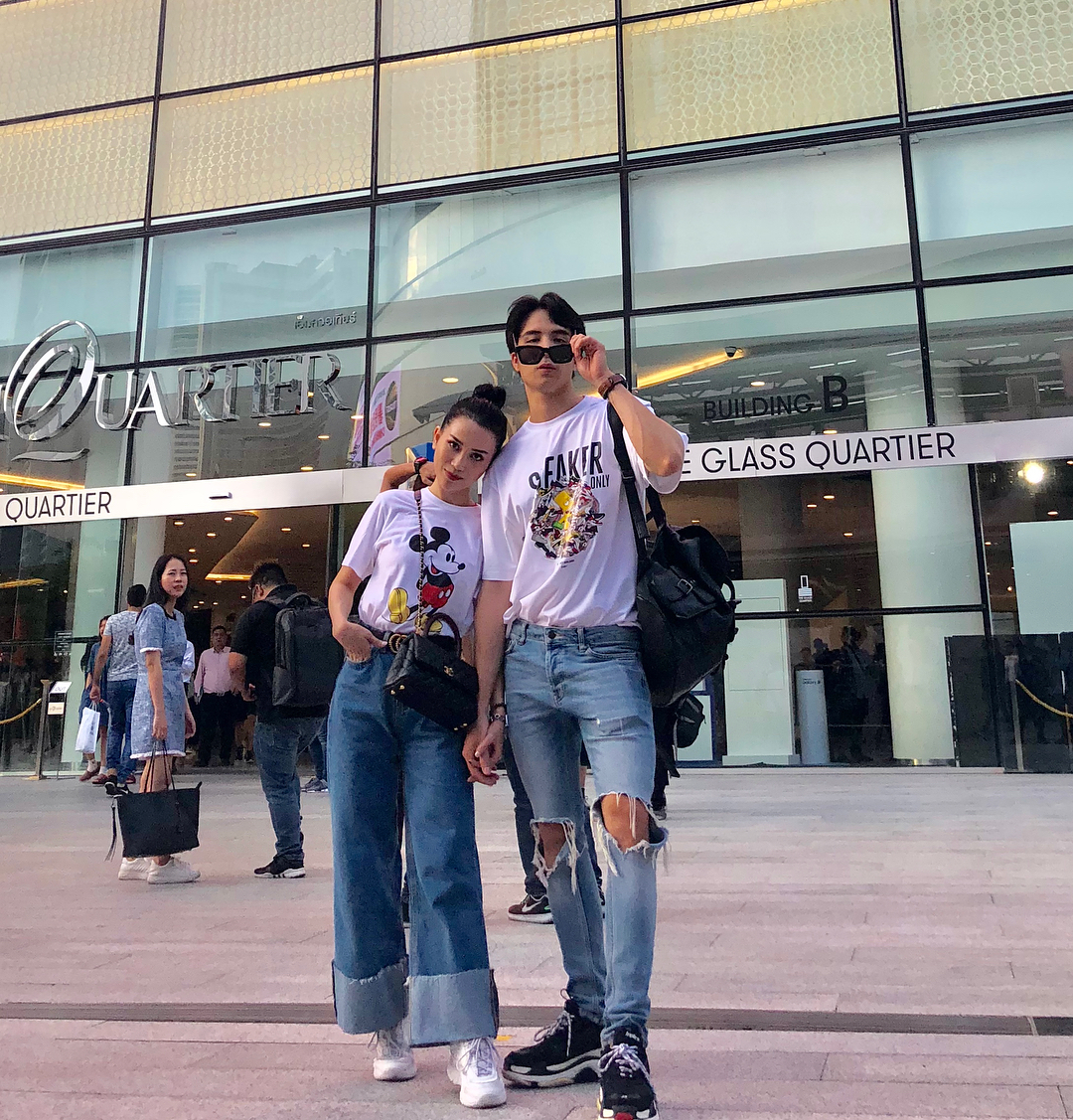 Combo áo phông in họa tiết cùng quần jeans rách và giày sneaker là cách Sĩ Thanh cùng bạn trai trở nên nổi bật trên phố.