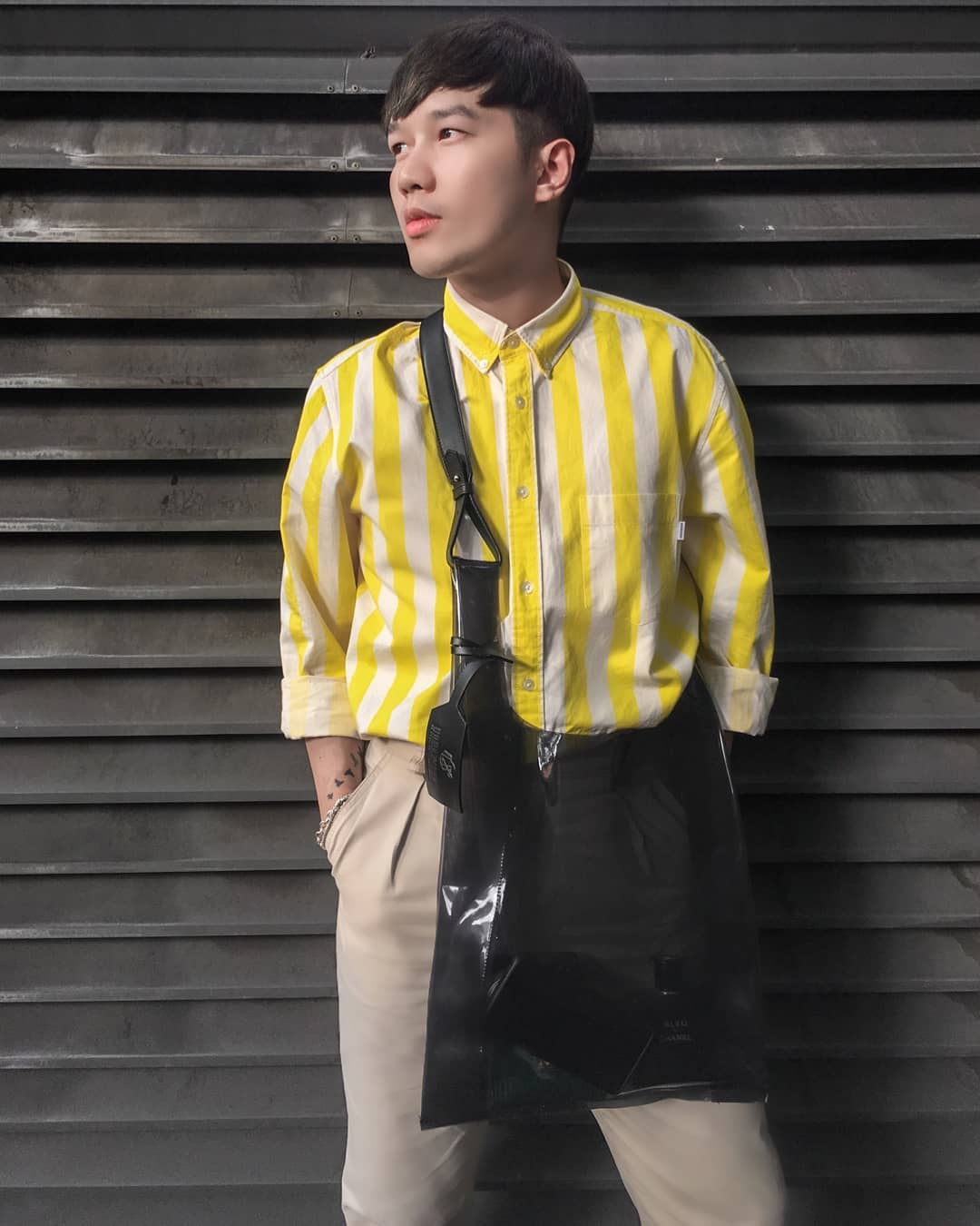 Áo sơ-mi vàng, quần tây camel cùng chiếc túi đeo chéo PVC bag, stylist Lê Minh Ngọc thật biết cách khiến tín đồ thời trang thèm muốn những item mà anh sở hữu.