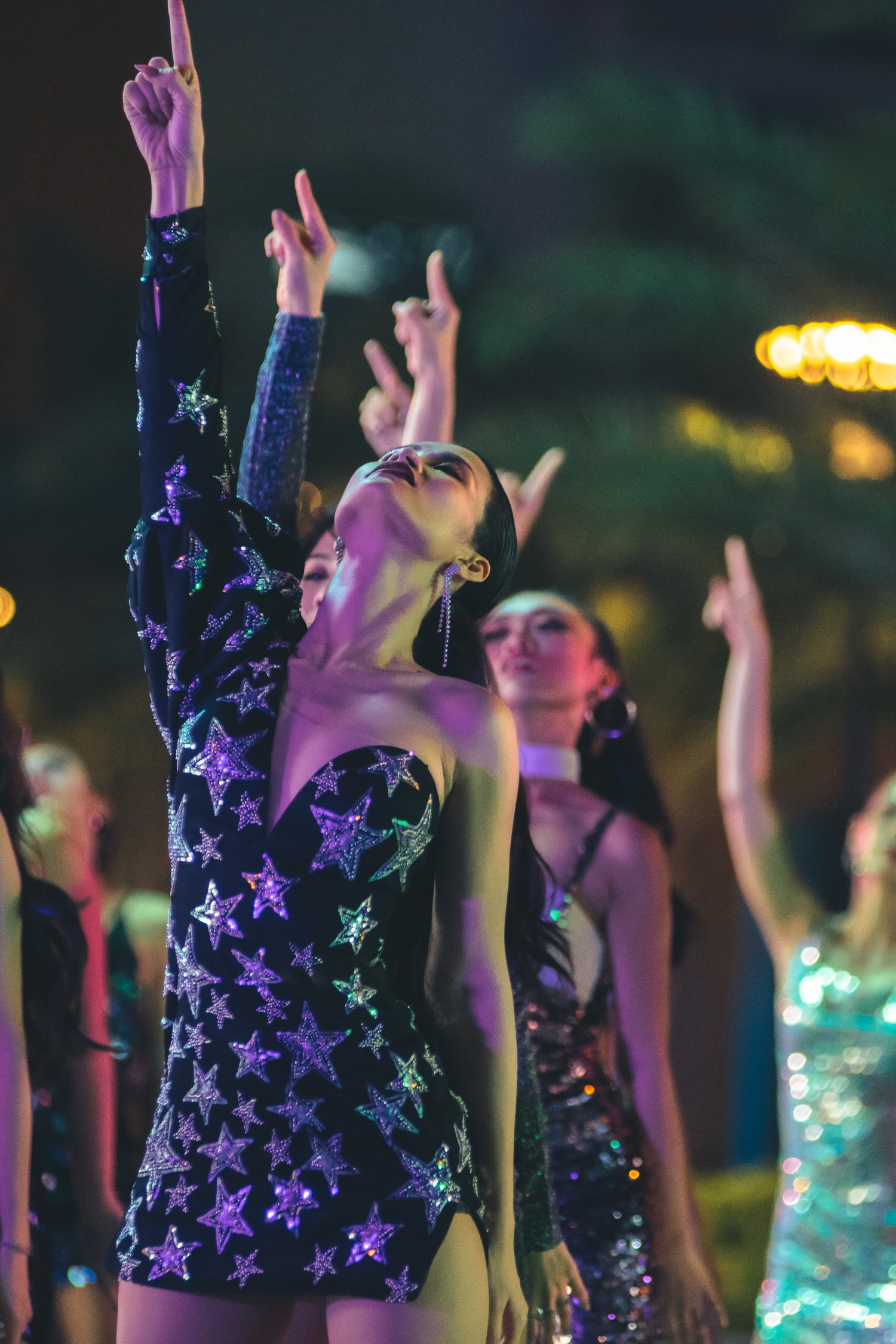 Chiếc váy ngắn bất đối xứng thêu đính họa tiết sao trời khoe trọn vòng một của nữ ca sĩ.