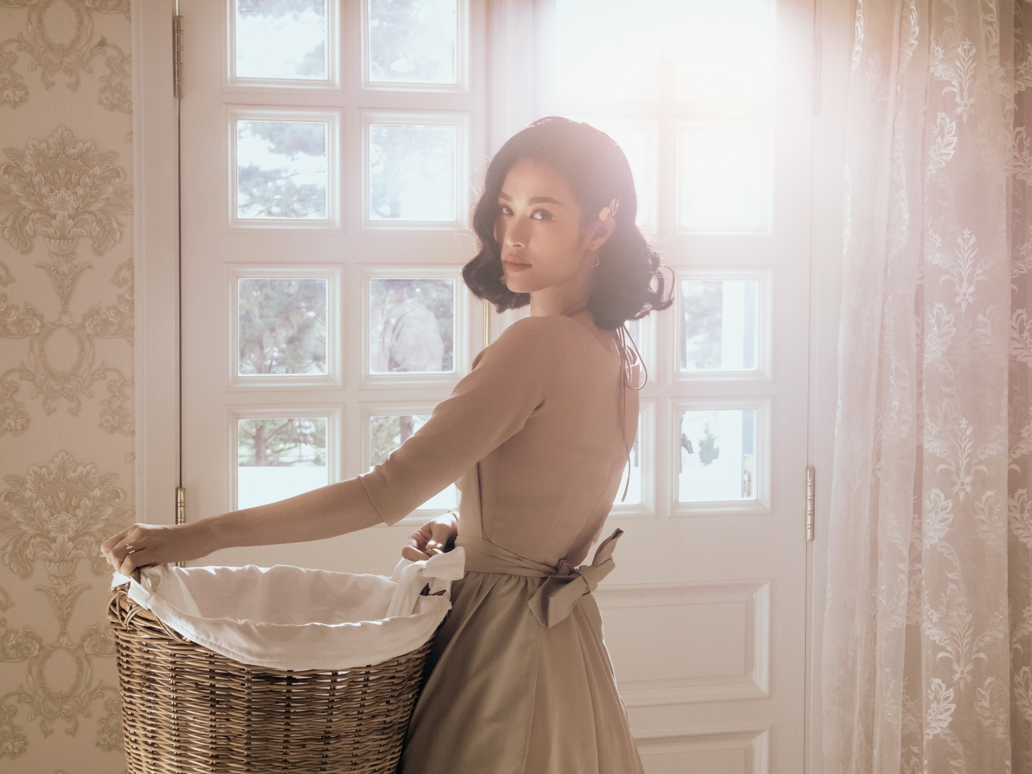 Một điều thú vị là nếu trong campaign, Gigi Hadid là người diện mẫu thiết kế này trong một căn phòng với màu trắng-vàng, thì bối cảnh chính của MV cũng là một căn biệt thự vô cùng đẹp với hai màu trắng - vàng chủ đạo, dẫn đến Đông Nhi vô tình “đụng” Gigi Hadid từ trang phục đến bối cảnh.