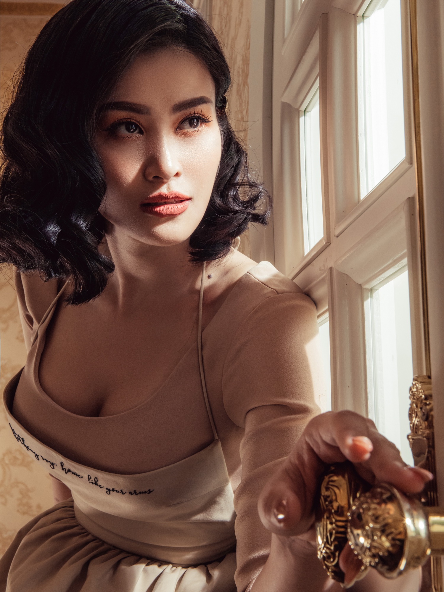 Mái tóc xoăn, trang phục khoe nhẹ vòng một đem lại chút cảm giác cổ điển, thu hút.