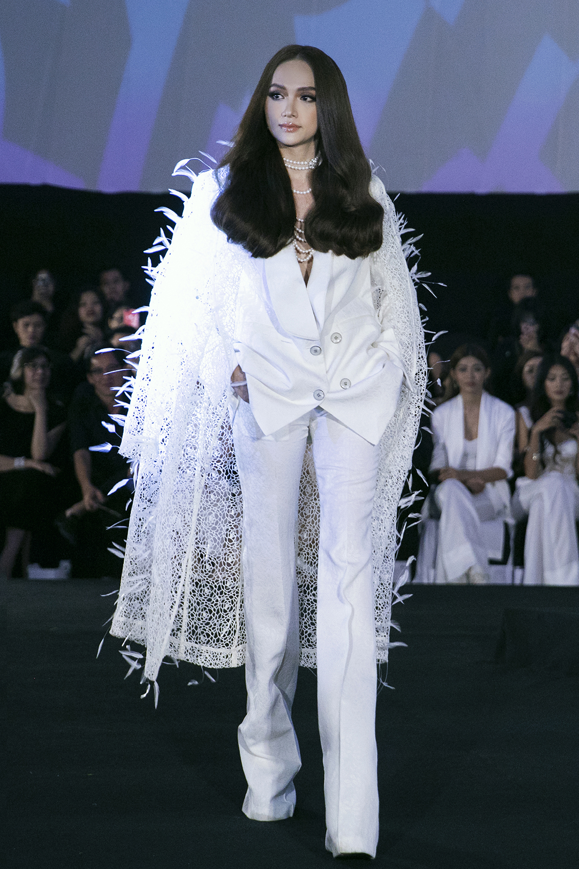 Diện cây vest trắng phối áo khoác ren mong manh, chân dài được để làm kiểu tóc uốn xoan, két hợp cùng lối kẻ mắt xếch vừa ấn tượng, hiện đại lại phảng phất nét lôi cuốn. Hương Giang thả những bước chân vững chãi, chắc nhịp trên nền nhạc được thể hiện bởi danh ca Thanh Hà.