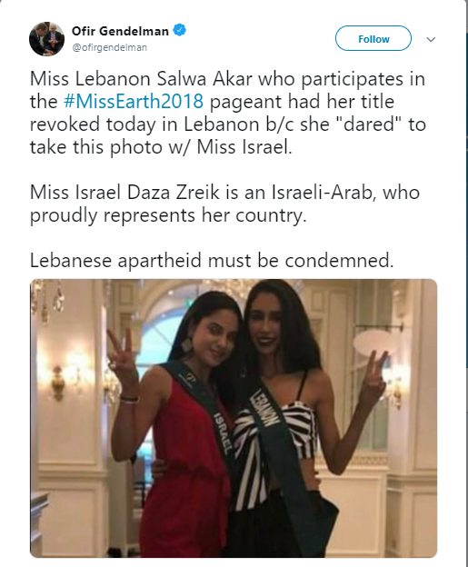 Ông Ofir Gendelman, phát ngôn viên tiếng Ả rập của thủ tướng Israel Benjamin Netanyahu, ngày 17-10 thông báo trên tài khoản Twitter cho biết vì bức ảnh chụp chung này, cô Akar “đã bị tước vương miện tại Lebanon vì đã dám chụp ảnh với hoa hậu Israel”. Cũng theo ông Ofir Gendelman “chủ nghĩa phân biệt chủng tộc của Lebanon cần phải bị lên án”.