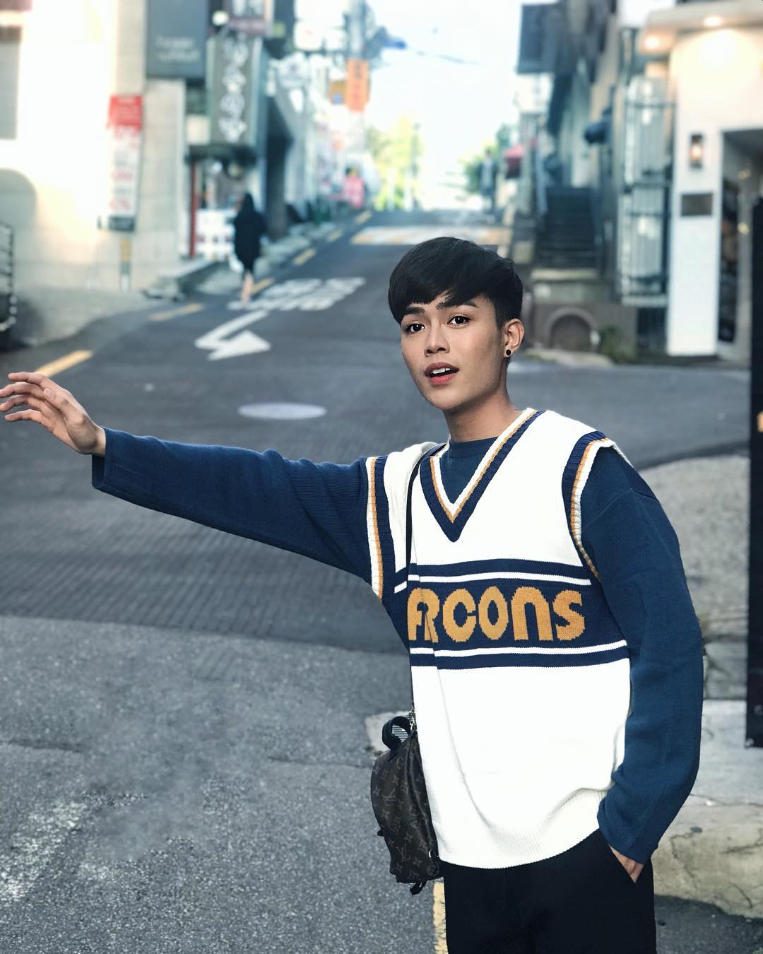 Hot boy của team Lam Trường - Alex Dương lại vô cùng điển trai khi mix layer áo phông cùng áo len khoác ngoài. Anh chàng còn sử dụng ba lô mini của Louis Vuitton làm điểm nhấn.