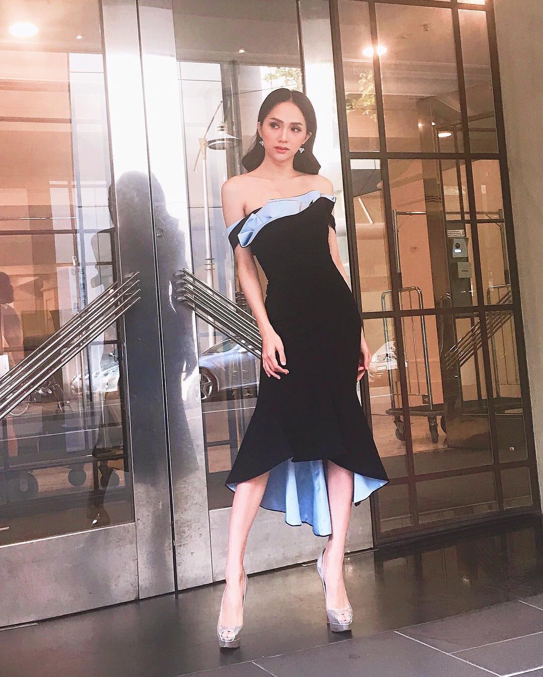 Chiếc đầm đuôi cá trễ nải phối 2 màu vải là outfit mà Hương Giang chọn khi tung tăng tại nước ngoài.