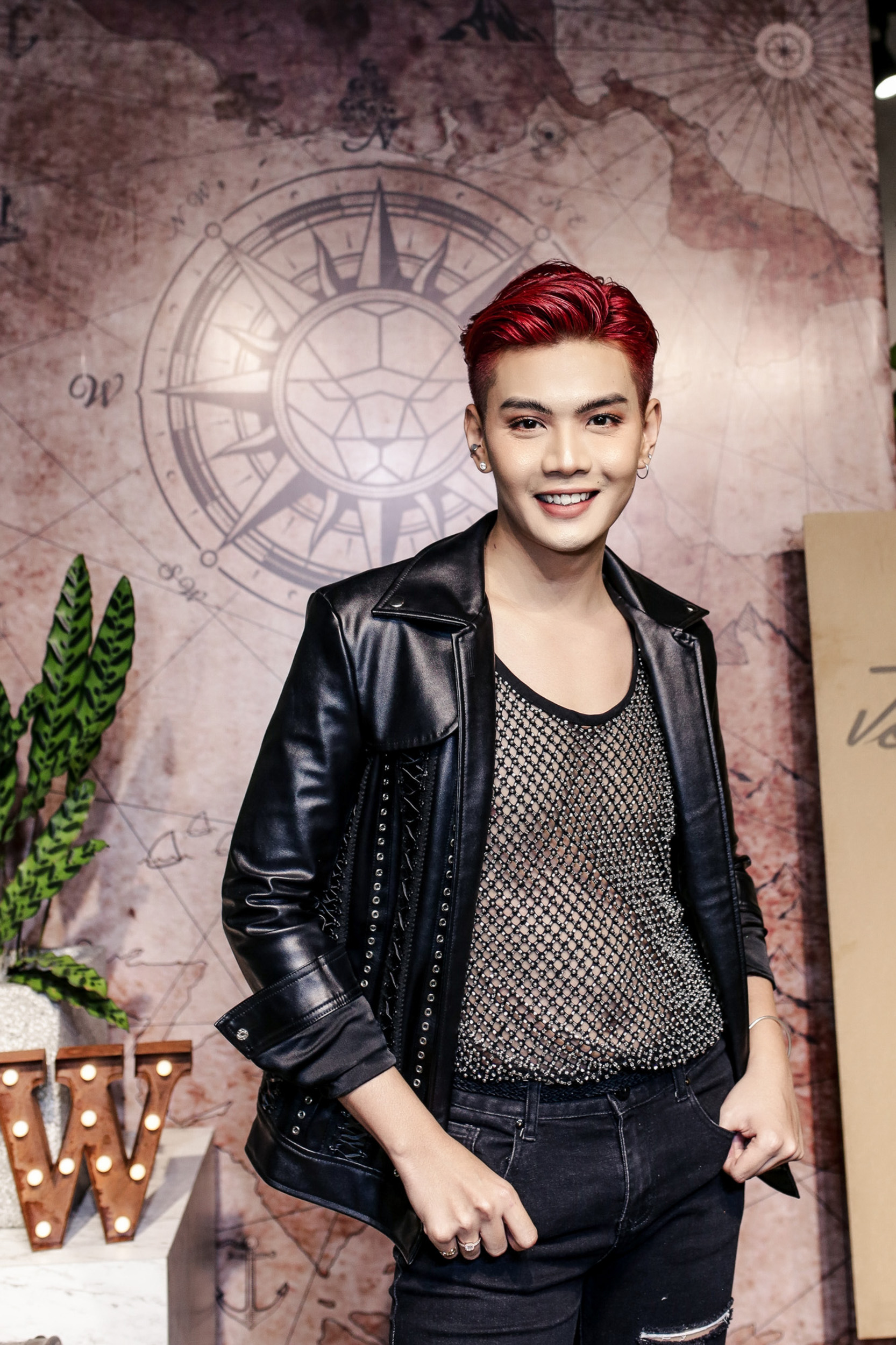 Diện trang phục ton sur ton đen với áo khoác da, phía trong là áo lưới xuyên thấu khoe da thịt và đôi boots chất lừ, nam ca sĩ nổi bần bật ngay khi đến sự kiện.