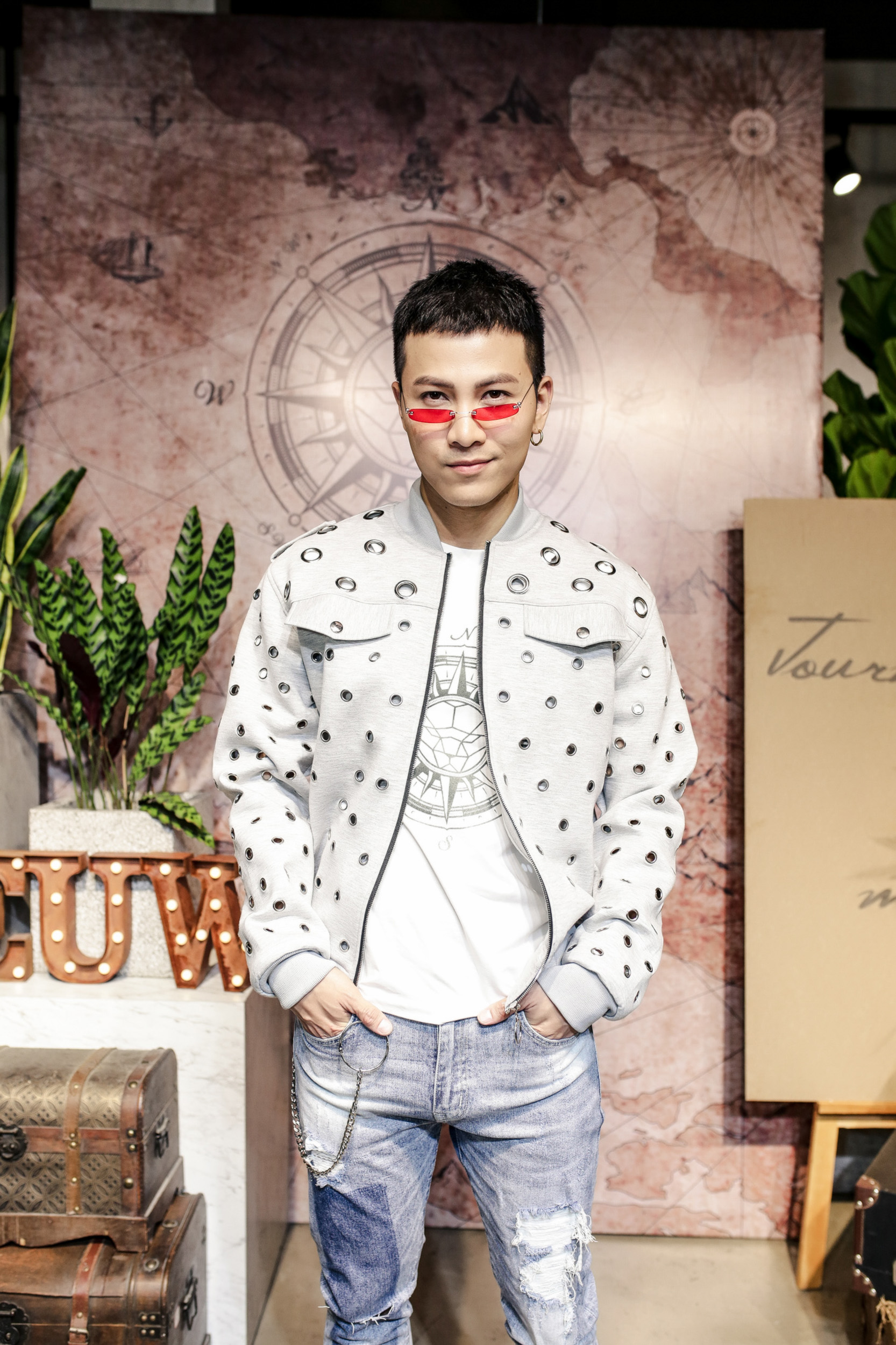 Ca sĩ Mai Tiến Dũng với áo bomber đục lỗ mix layer cùng áo phông và quần jeans rách.
