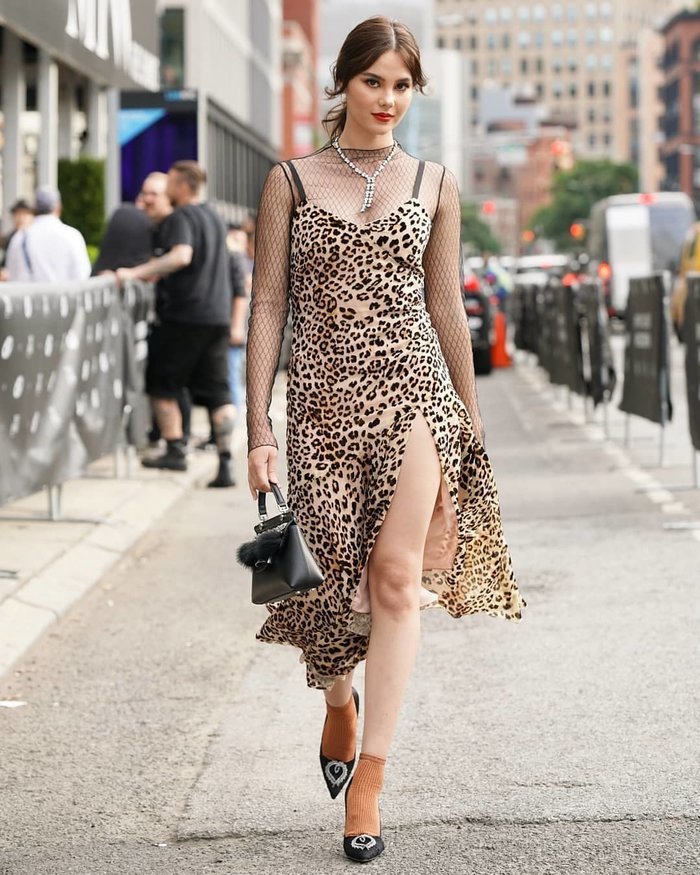 Nhiều người không hiểu sao cô lại diện chiếc đầm da beo kết hợp với đôi vớ đầy tội lỗi.