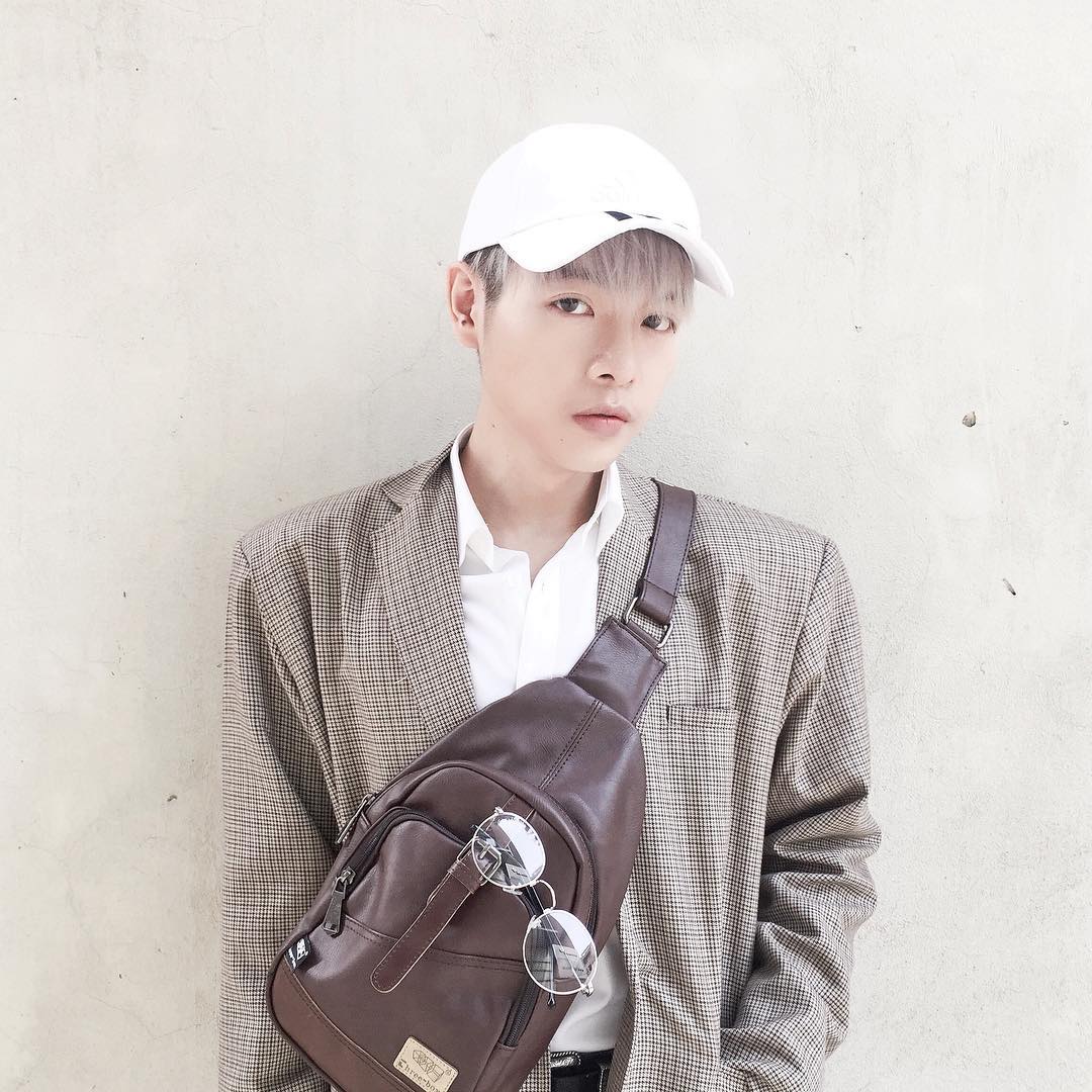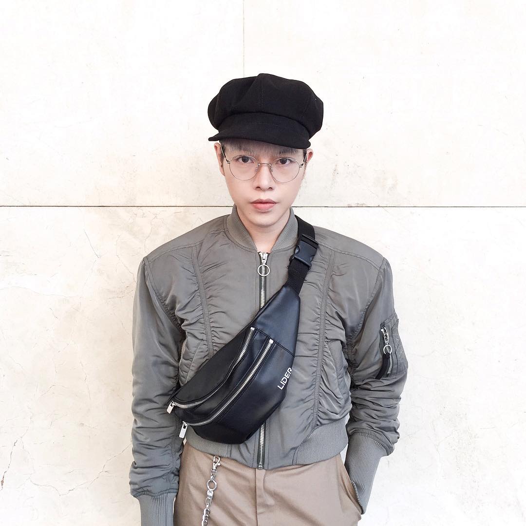 Một lần khác nam ca sĩ phối sơ mi trắng cùng áo độn vai kẻ sọc trẻ trung. Đi kèm với đó là chiếc túi da đeo chéo năng động.