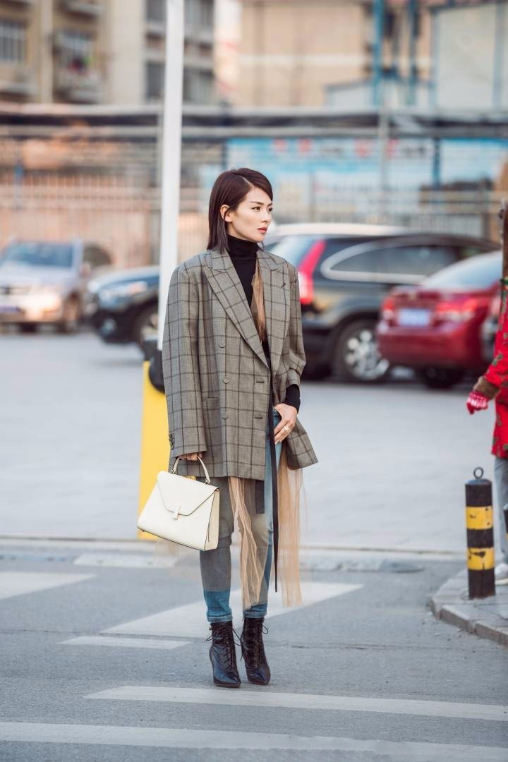 Nữ diễn viên Lưu Đào cũng có bộ đồ ấn tượng với áo blazer kẻ độn vai kiểu dáng oversized rộng rãi. Cô mặc với quần jeans và boots cao buộc dây, dải khăn voan khiến set đồ bớt cứng nhắc.