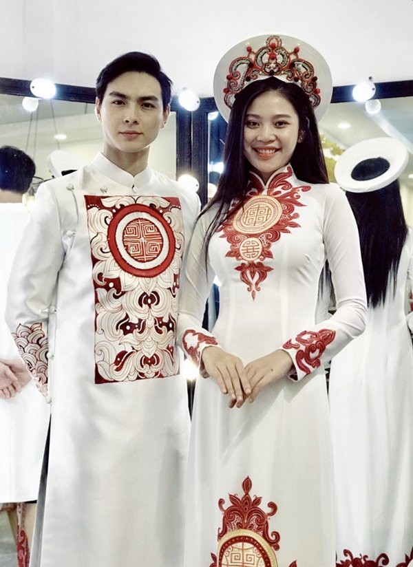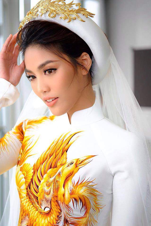 Lan Khuê cũng chọn mẫu áo dài trắng, được vẽ họa tiết chim phượng trong ngày vui đời mình.