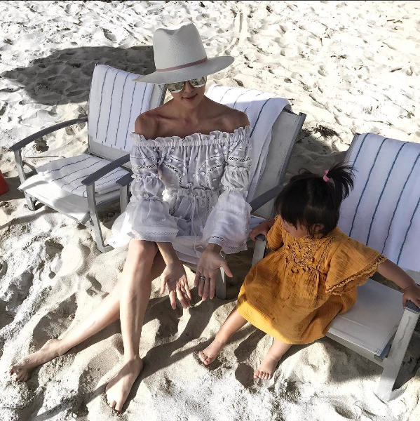 Kết hợp ăn ý trong phong cách đi biển. Chriselle tinh khôi trong váy peplum trễ vai còn bé Chloe nhỏ nhắn trong chiếc váy nâu vàng mang phong cách nhiệt đới.
