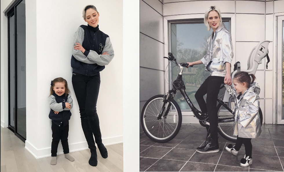 Siêu mẫu mẹ và “siêu mẫu” con chất lừ với áo khoác, quần jogger và áo phông.