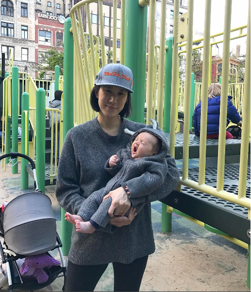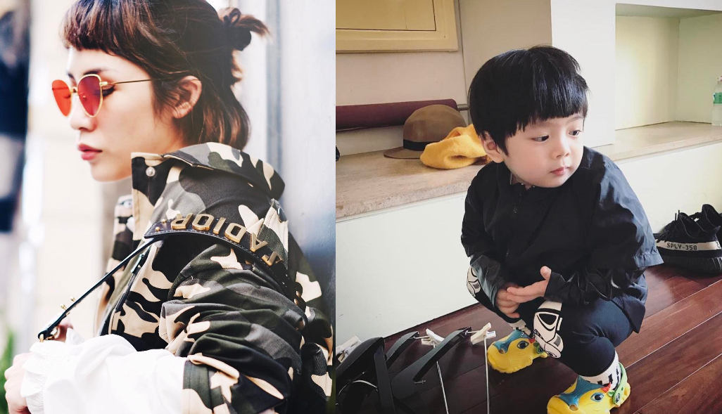 Eva Chen và bé Tao cùng xuyệt tông áo màu ghi.