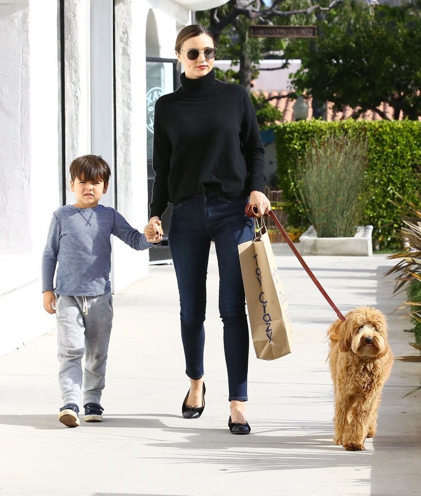 Hai mẹ con không quá cầu kỳ trong kiểu dáng quần áo. Miranda Kerr chỉ cần diện áo phông, quần dài đã là đủ đẹp còn nhóc Flynn đơn giản nhưng vẫn ngầu với áo phông - quần jean - giày thể thao. Chiếc mũ lưỡi trai tăng thêm nét đỏm dáng.