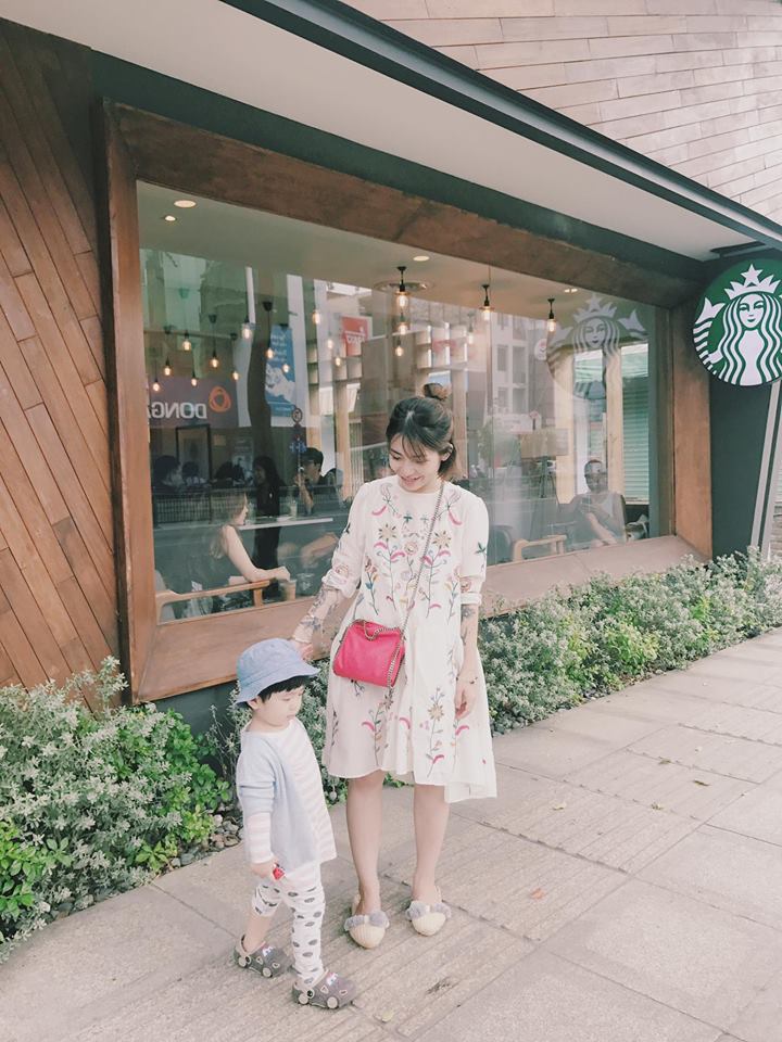 Hai mẹ con xuất hiện cùng nhau với phong cách rất đồng điệu. Khi Lâm Thúy Nhàn dịu dàng trong váy hoa bồng bềnh thì nhóc Hehe trong sáng với quần áo mang họa tiết ngộ nghĩnh, đi dép cá sấu và đội mũ bucket. Màu sắc trang phục của cặp đôi mẹ con này rất hợp rơ với nhau.