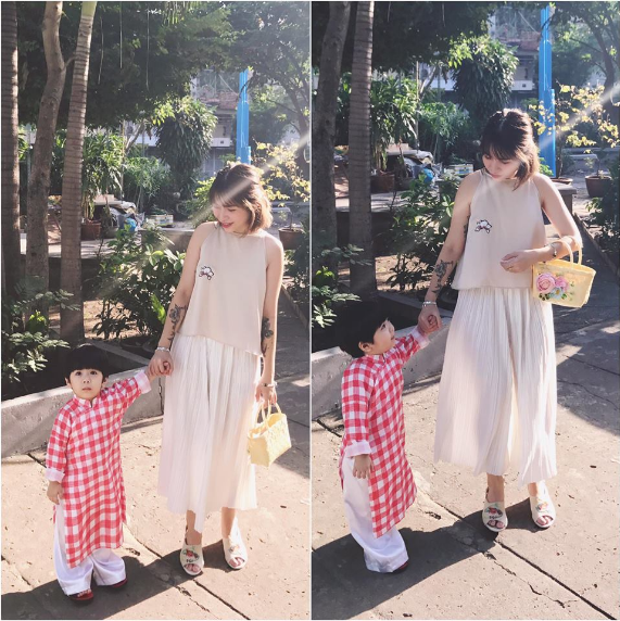 Đơn giản, thanh lịch là cụm từ luôn xuất hiện cùng hai mẹ con nhà stylist Việt. Bé Hehe đáng yêu trong bộ áo dài cách tân kẻ caro.