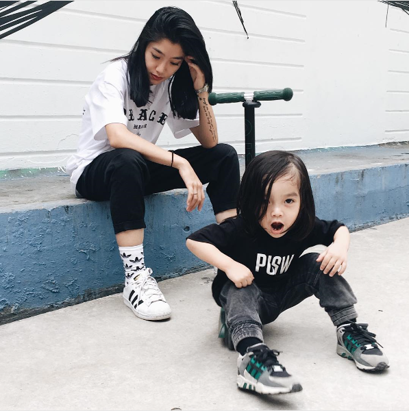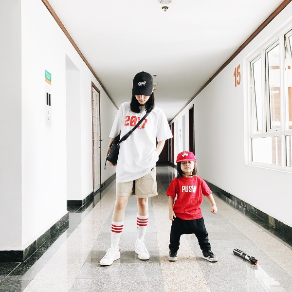 Không ngạc nhiên gì khi bé Pid lại có gu thời trang chất đến thế. Những chiếc áo slogan tee trở thành thương hiệu của mẹ Stu bé Pid.