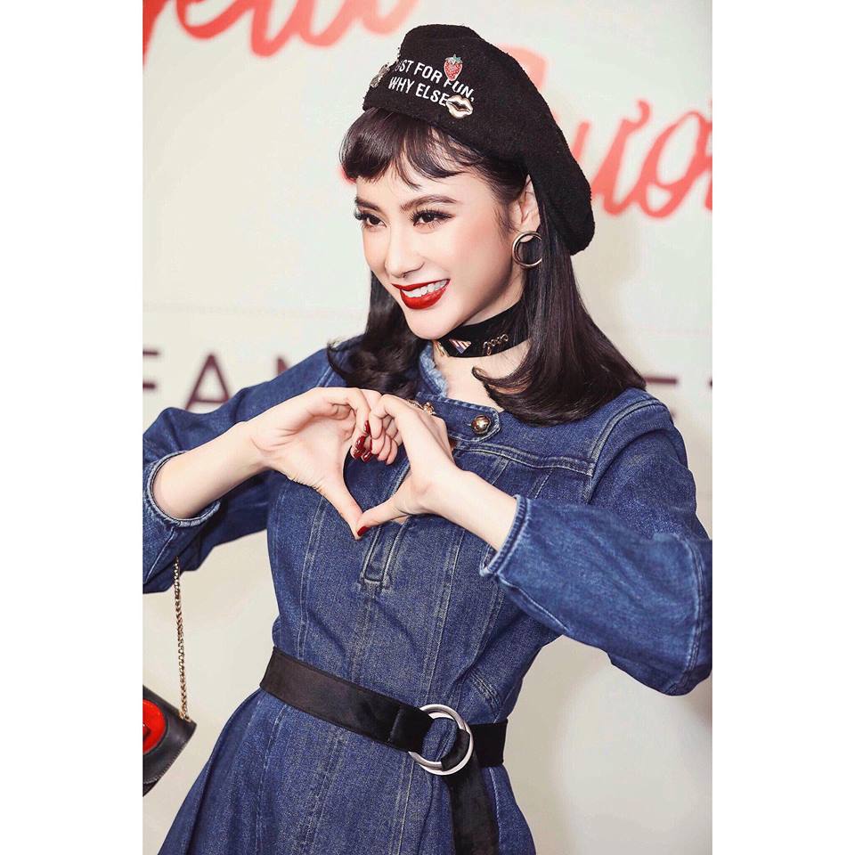 Tuy vậy, cô nàng vẫn trung thành với màu tóc đen huyền, kết hợp với làn da trắng sứ, Elly Trần trông như 1 nàng búp bê xinh đẹp.