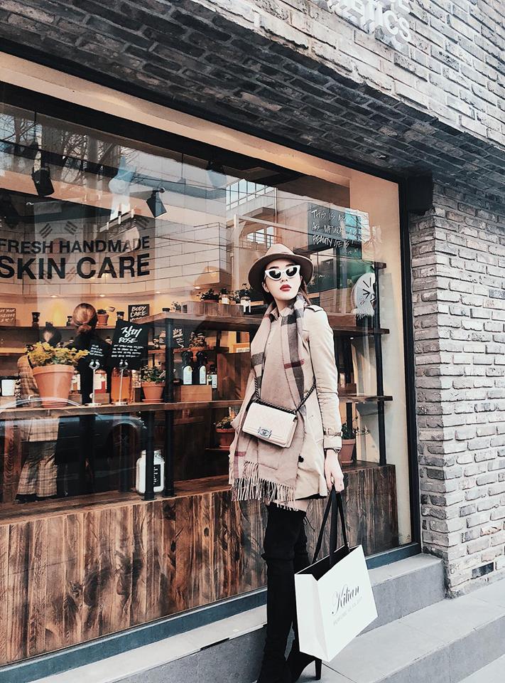 Minh Hằng trong bức hình mới nhất trên Instagram cũng đã khoe một cây hàng hiệu từ áo Moschino, kính mắt mèo sành điệu cùng thương hiệu với Kỳ Duyên.