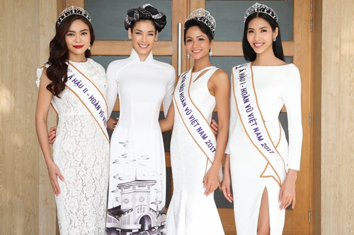 Với kiểu tóc này H'Hen Niê bị lọt thỏm khi đứng cạnh Mâu Thủy, Hoàng Thùy và cựu Hoa hậu Hoàn vũ 2008.