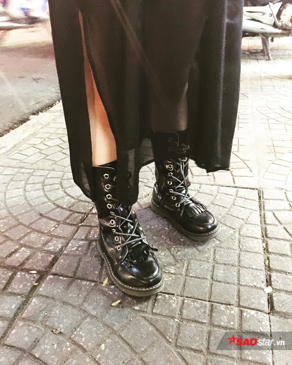 Đôi boots da cổ cao góp phần làm điểm nhấn mấu chốt cho cả set đồ. “Chất” như thế này bảo sao ai cũng phải ngoái nhìn!