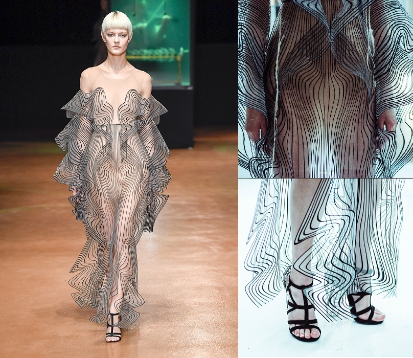 Các thiết kế có thể thấy Iris van Herpen đã chịu ảnh hưởng sâu sắc của hai nguồn cảm hứng bất tận từ thiên nhiên, đó là nước và không khí khiến người xem cảm nhận được “trọng lượng” mà bộ sưu tập đem lại.