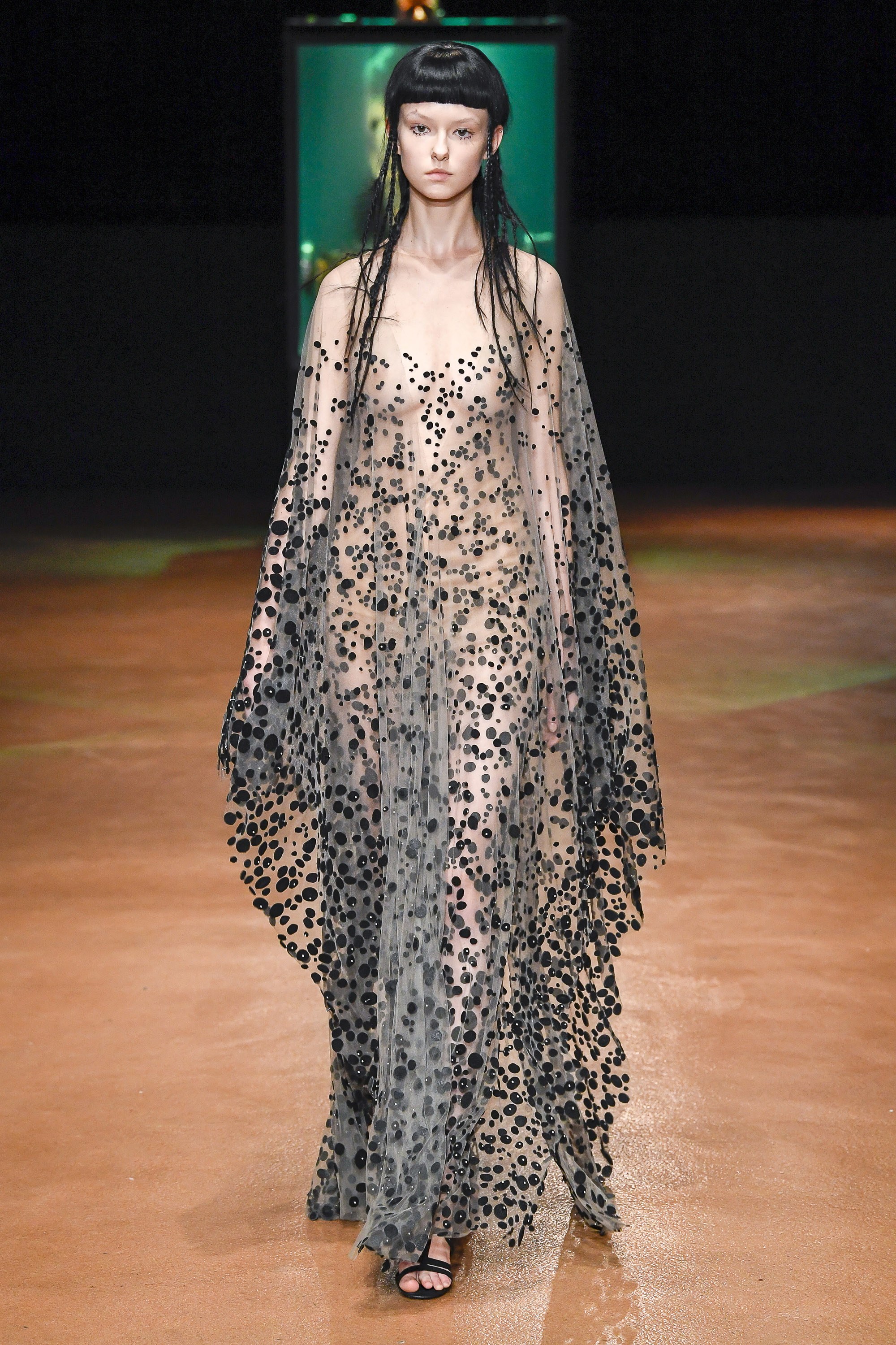 Chiếc đầm dài trong suốt nổi bật bằng họa tiết đốm chấm.