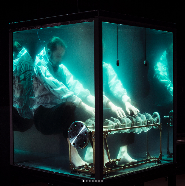 Không gian biểu diễn xung quanh bao trùm trong bóng tối và được thắp sáng bằng ánh đèn từ trong bể kính.