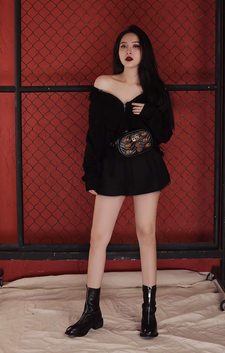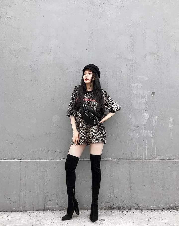 Áo len dệt kim chui đầu đi cùng đôi boots cao quá gối, khoe trọn đôi chân dài miên man.