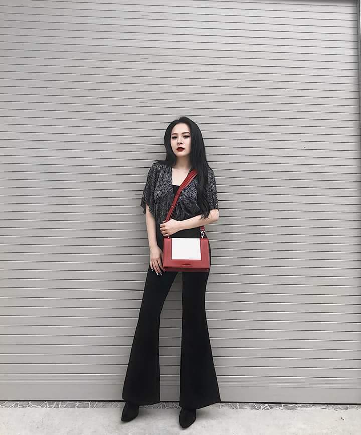 Hay set đồ được tăng điểm thời thượng với quần ống loe, phủ trọn giày cao gót. Nhìn vào tấm ảnh này, ai bảo Hàng My chỉ cao 1,56 m nào.