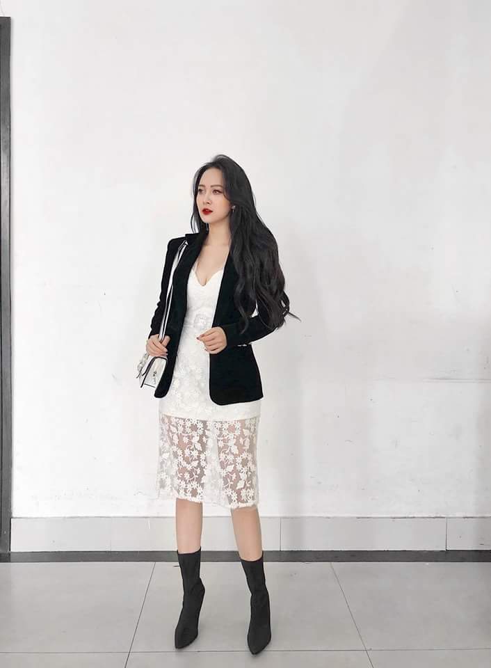 Váy ren với phần vải phủ dưới gấu váy cũng là một items được cô nàng tin tưởng trong công cuộc ăn gian chiều cao của bản thân.