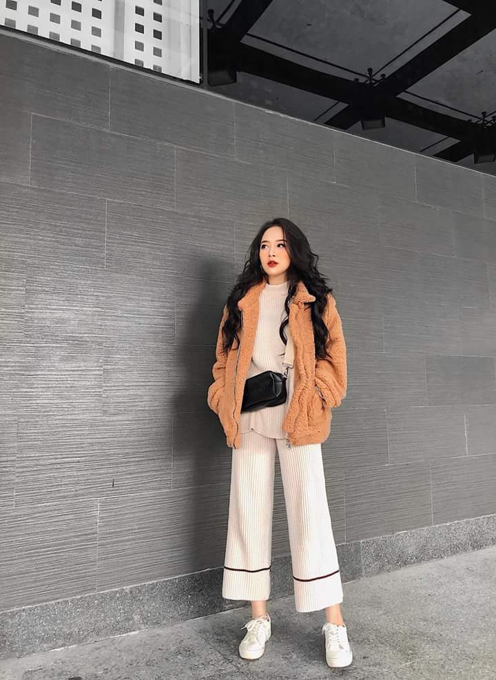 Culottes trắng cao trên mắt cá phối cùng áo khoác dạ nâu tông màu đất.