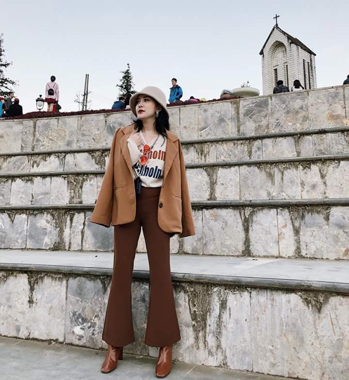 Quần ống loe phối cùng boots nâu đỏ cũng là một bí quyết giúp cô nàng hack chiều cao đáng kể.